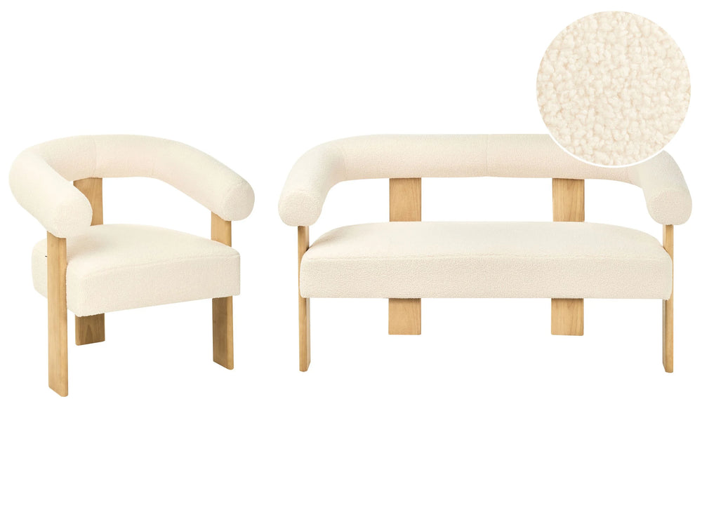 Sofa Set Off-White and Light Brown 2 Seater Armchair Boucle Upholstery Retro Design Wooden Legs Living Room Beliani
