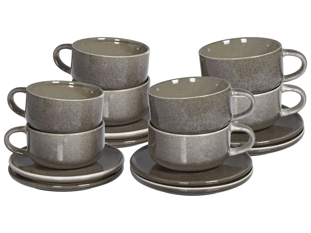 Set of 8 Cups with Saucers Grey Stoneware Kaolin Handmade Reactive Glaze Finish Service for 8 People Tea Coffee Kitchen Dining Room Beliani