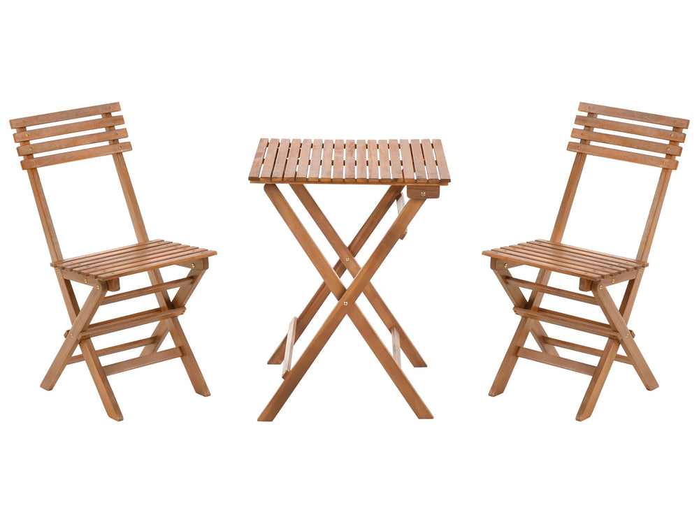 3 Piece Bistro Set Brown Solid Certified Acacia 2 Chairs and Tea Table Folding Slatted Design Beliani is backordered and will ship as soon as it is back in stock.