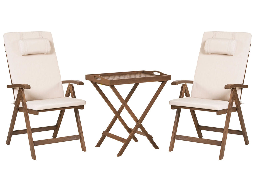 Garden Bistro Set Solid Acacia Wood with Light Beige Cushions Table 2 Chairs Adjustable Backrest Folding Rustic Style Balcony Furniture Beliani