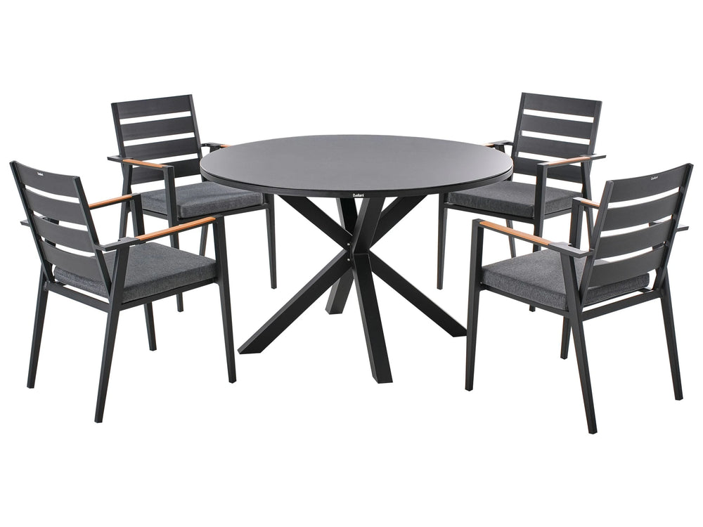 4 Seater Garden Dining Set Black Aluminium Round Table with Ceramic Glass Top Slatted Chairs with Grey Seat Pad Cushions Beliani
