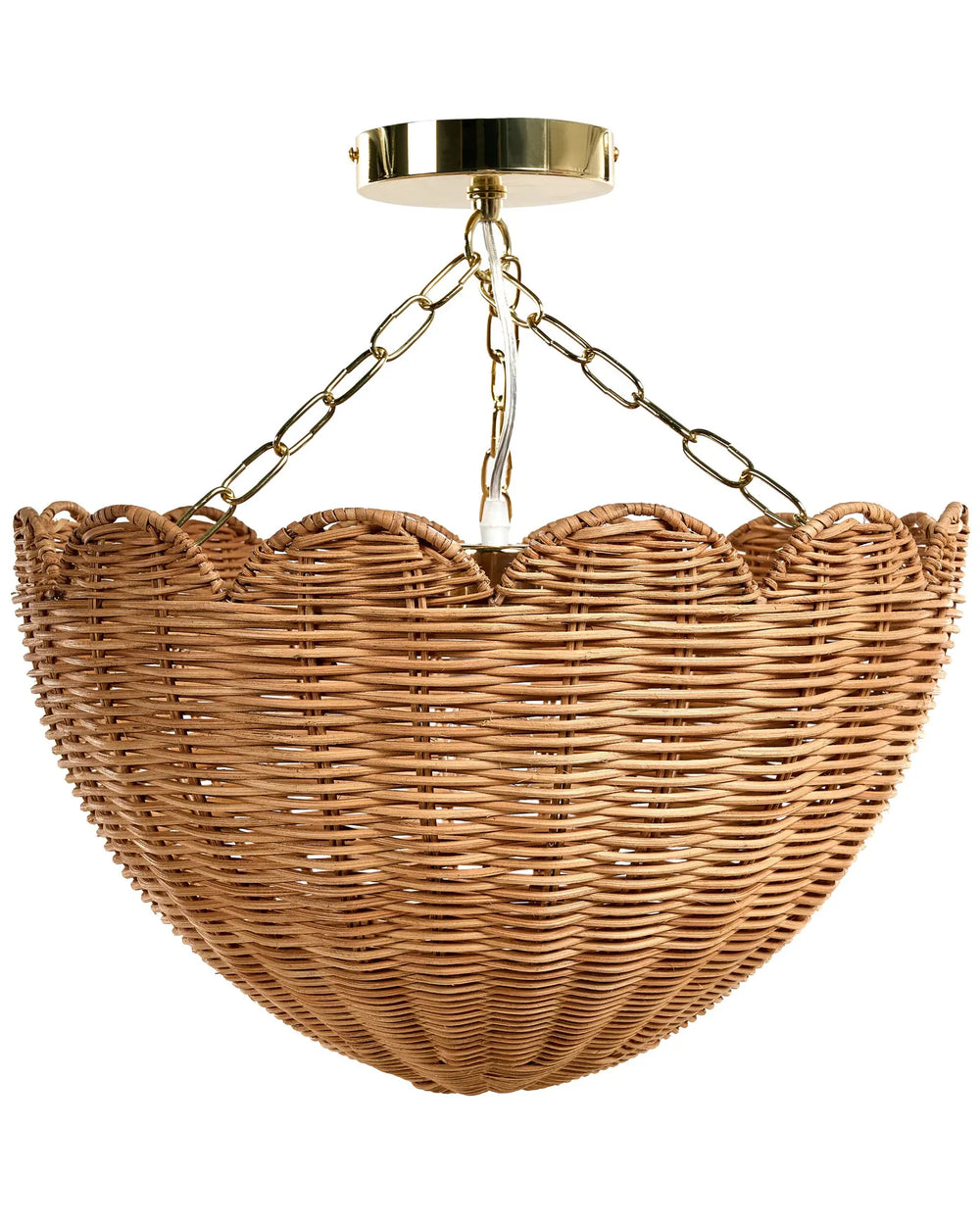 Add a special look to your room with this unique flush mount pendant, perfect for bringing a touch of boho charm and vintage vibes to your space. The rattan scalloped edge lampshade paired with a subtle gold cup creates a lovely balance of texture and elegance. Light is gently directed upwards, casting soft, decorative shadows on the ceiling for a cosy, layered effect. Ideal if you're after something a little different that still feels warm and welcoming.