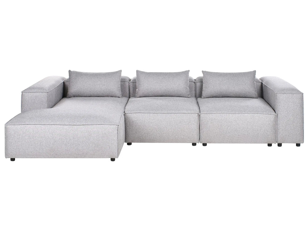 Designed with comfort and functionality in mind, this 4-seater modular sofa with a right-hand chaise is perfect for sinking in and relaxing. Upholstered in easy-to-maintain fabric and equipped with plush foam padding, it offers a supple and supportive seating surface. Soft foam-filled cushions and wide armrests provide excellent support whether you're reading, watching TV, or hosting guests. Its elegant grey finish and fashionable outline blend effortlessly with neutral tones and bold accents alike. The sofa is made up of three modular sections, offering you the flexibility to arrange them in various configurations, either together or apart. Three matching backrest cushions are included to enhance comfort and visual harmony.