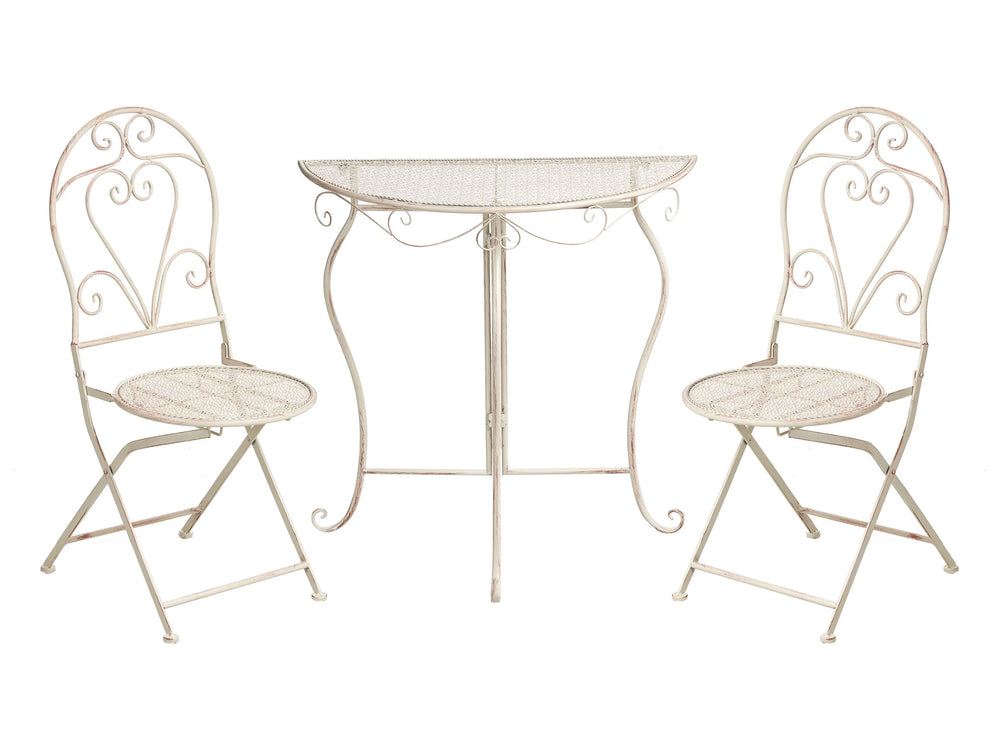Perfect for creating a cosy outdoor retreat, this balcony set combines practicality and vintage charm. Crafted from sturdy iron with a soft, weathered finish, it features two foldable chairs and a space-saving table. The delicate design adds a timeless elegance to your balcony or garden, making it an ideal choice for enjoying tea or coffee outside.