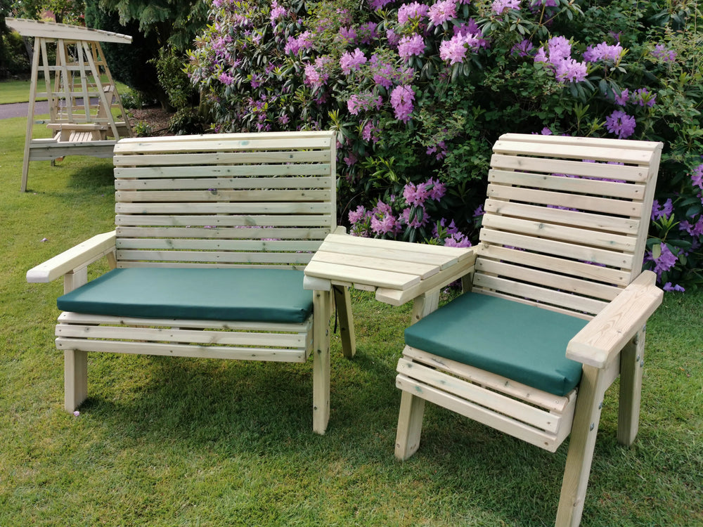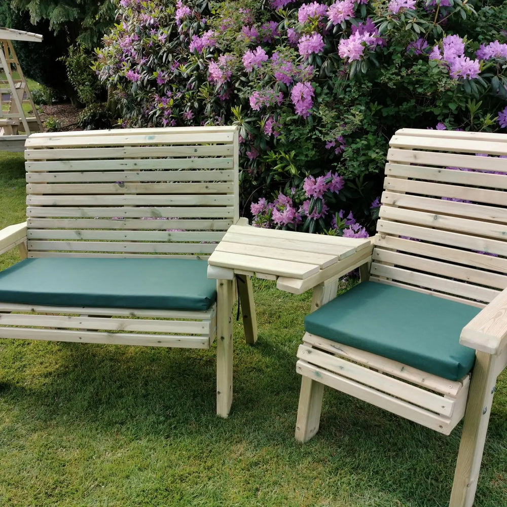 The Ergo Trio Set has been ergonomically designed with an angled and extended curved backrest to provide ultimate comfort and support. It is Ideal for spending time with a special friend or member of the family. The set comprises of one single chair and one 2 seater bench connected with a handy angled tray that rests on the arms, the tray lifts on and off with ease allowing you the freedom to relocate the chairs easily in your garden. Made from premium, pressure treated FSC certified timber to resist rot for up to 20 years with proper care.Also available in a straight configuration. Please note seat cushions are not included and can be purchased separately.