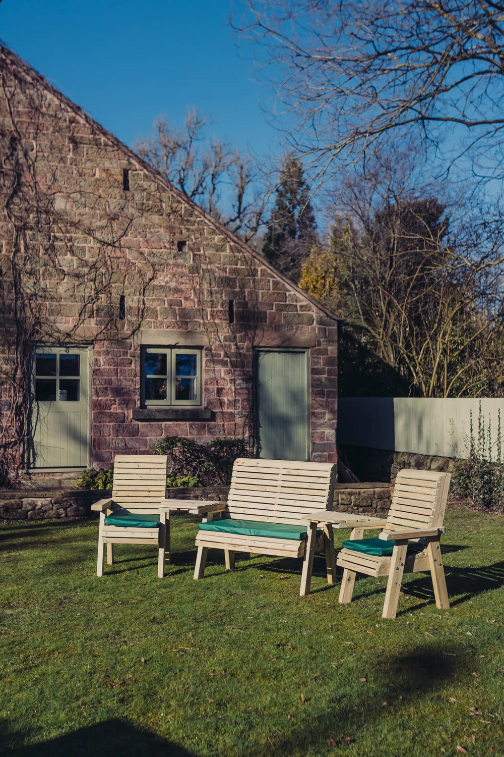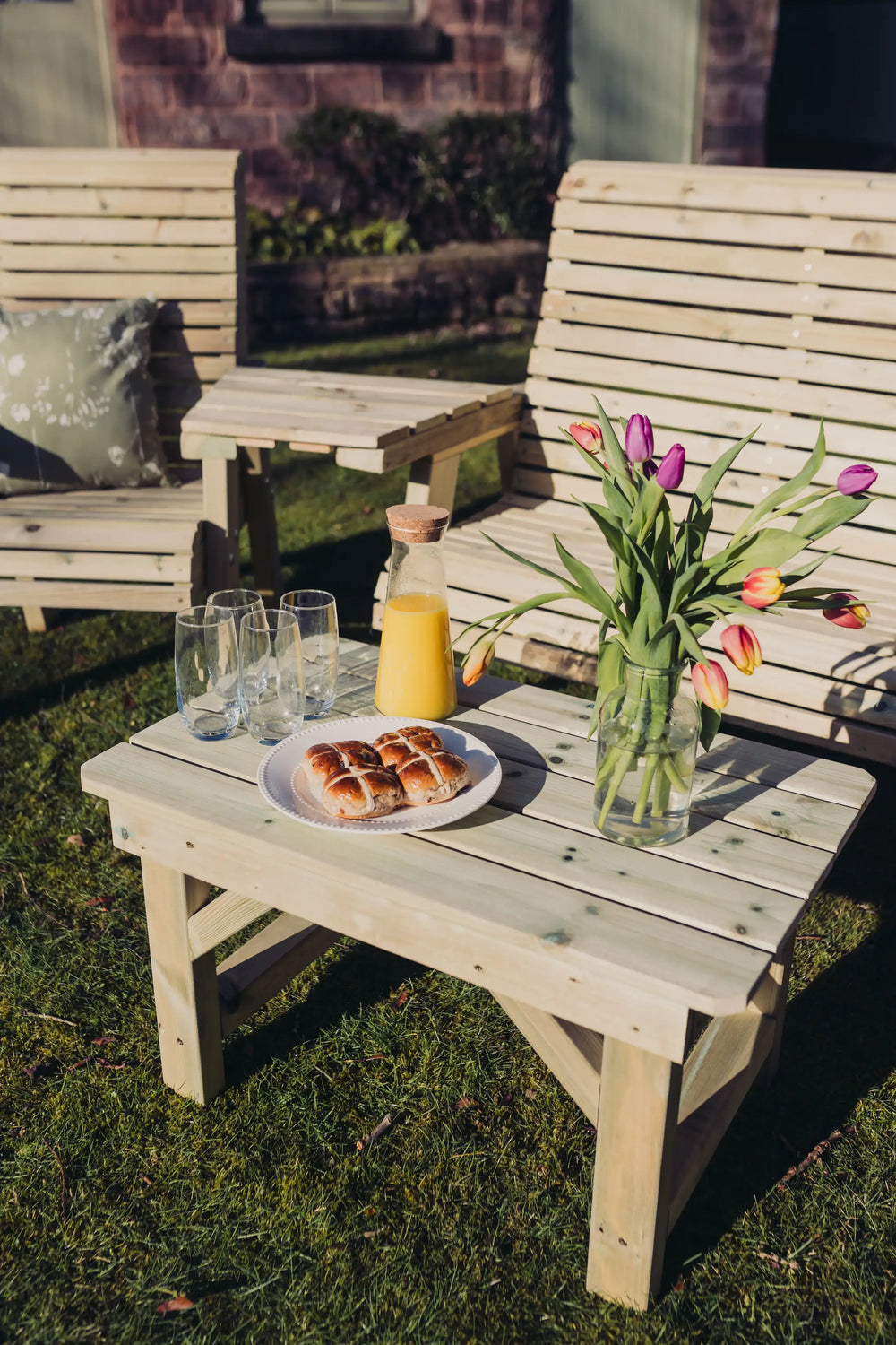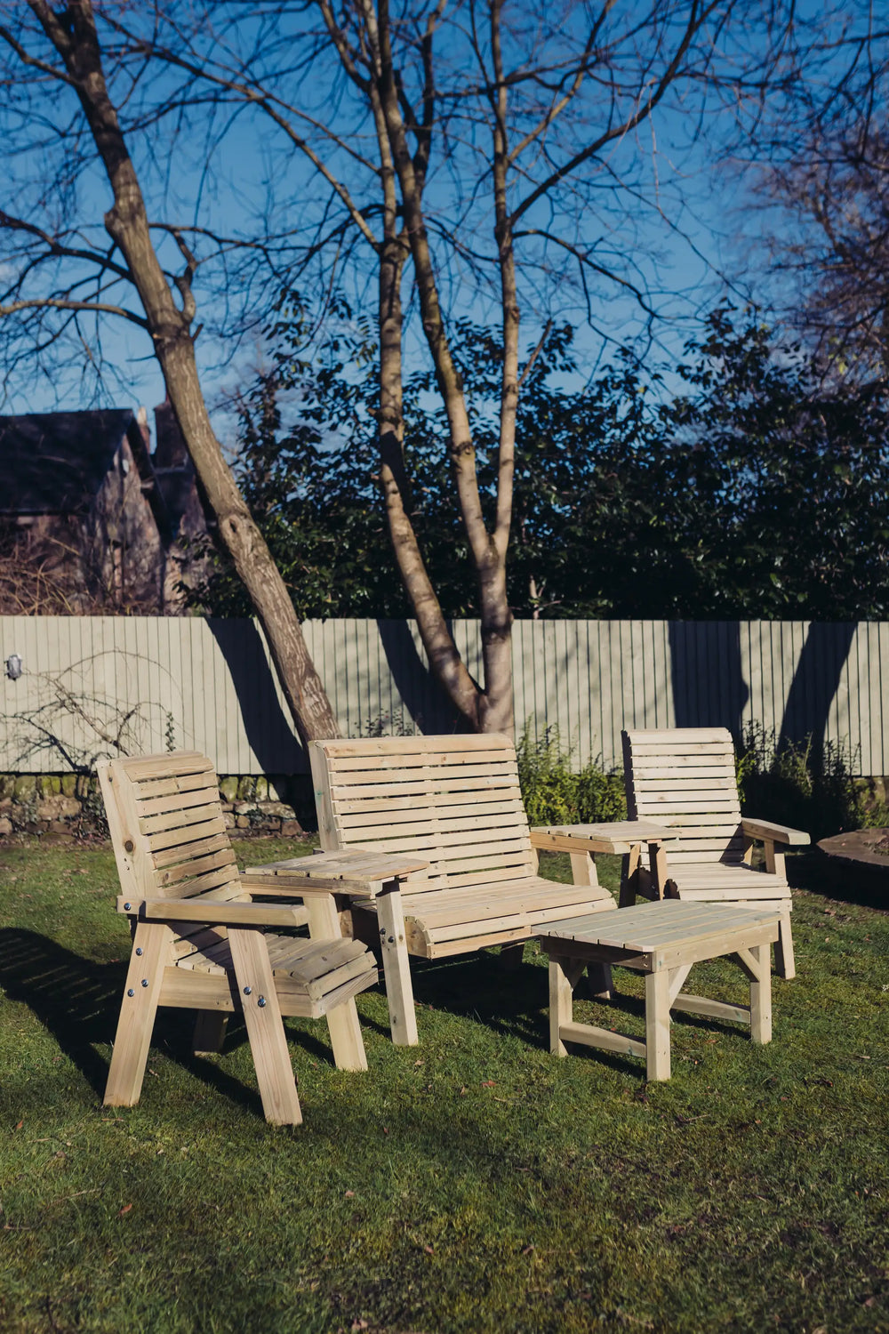The Ergo Trio Set has been ergonomically designed with an angled and extended curved backrest to provide ultimate comfort and support. It is Ideal for spending time with a special friend or member of the family. The set comprises of one coffee table, the two single chairs and the two seater bench are connected with two handy angled trays that rests on the arms, the trays lift on and off with ease allowing you the freedom to relocate the chairs easily in your garden. Made from premium, pressure treated FSC certified timber to resist rot for up to 20 years with proper care. Please note seat cushions are not included and can be purchased separately.