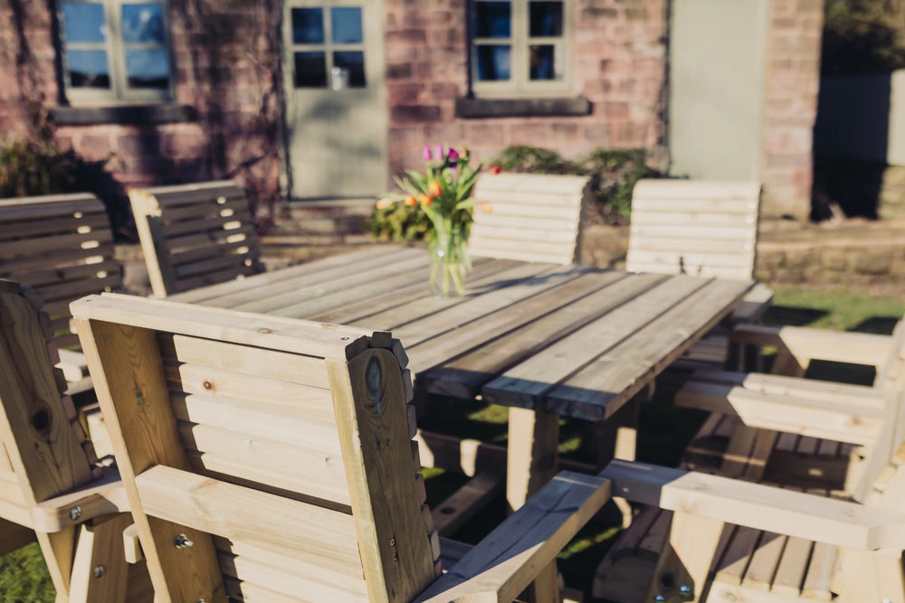 The Ergo 8 Seater Square Table Set will transform your garden into a stylish space for entertaining friends and family, with its durable design and natural finish. The chairs have been ergonomically designed with an angled and extended curved backrest to provide ultimate comfort and lumbar support. This set is perfect for those who value quality and functionality, whilst also adding a touch of natural charm to their garden. The set comprises of a spacious table and 8 ergonomic chairs. Made from premium, pressure treated FSC certified timber to resist rot for up to 20 years with proper care. Please note seat cushions are not included and can be purchased separately.