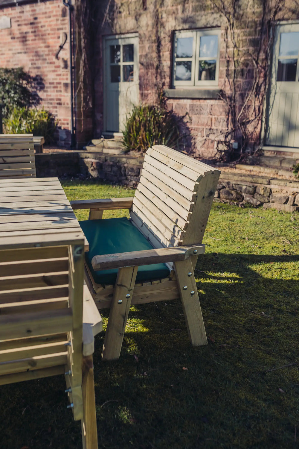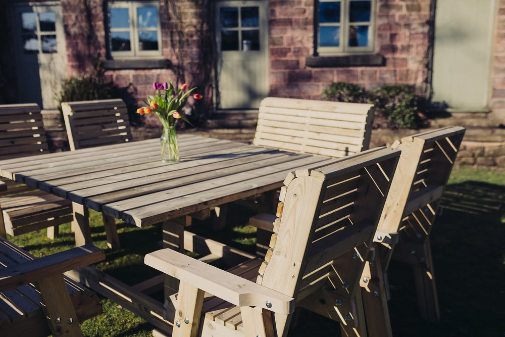 The Ergo 8 Seater Square Table Set will transform your garden into a stylish space for entertaining friends and family, with its durable design and natural finish. The chairs and benches have been ergonomically designed with an angled and extended curved backrest to provide ultimate comfort and lumbar support. This set is perfect for those who value quality and functionality, whilst also adding a touch of natural charm to their garden. The set comprises of a spacious table, 2 x two seater benches and 4 ergonomic chairs. Made from premium, pressure treated FSC certified timber to resist rot for up to 20 years with proper care. Please note seat cushions are not included and can be purchased separately.