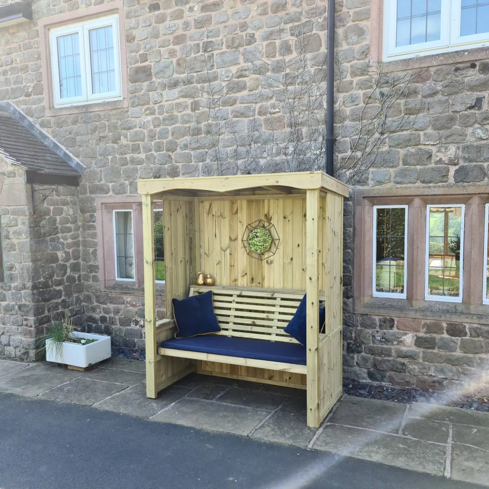 The Four Seasons Arbour is an inviting design that allows you to enjoy the great outdoors in a comfortable, shaded setting. It's beautiful, yet sturdy structure will beautify any garden space and will sit 3 comfortably. The tinted polycarbonate roofing also offers protection against U.V rays. Made from premium, pressure treated FSC certified timber to resist rot for up to 20 years with proper care. Please note seat cushions are not included and can be purchased separately.