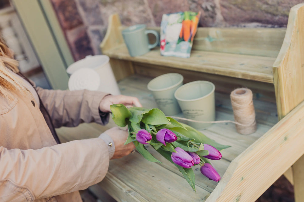 Features include a spacious flat working surface for potting plants and flowers, a narrow upper shelf perfect for displaying seed packets, and a large lower shelf ideal for storing essentials such as watering cans, plant pots, and grow trays.