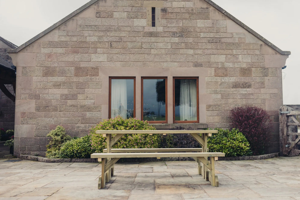 Lunar Walk-In Picnic Table 1800 mm FSC-Certified Pressure-Treated Timber Half-Moon Outdoor Table with Parasol Hole | Rustic Charm