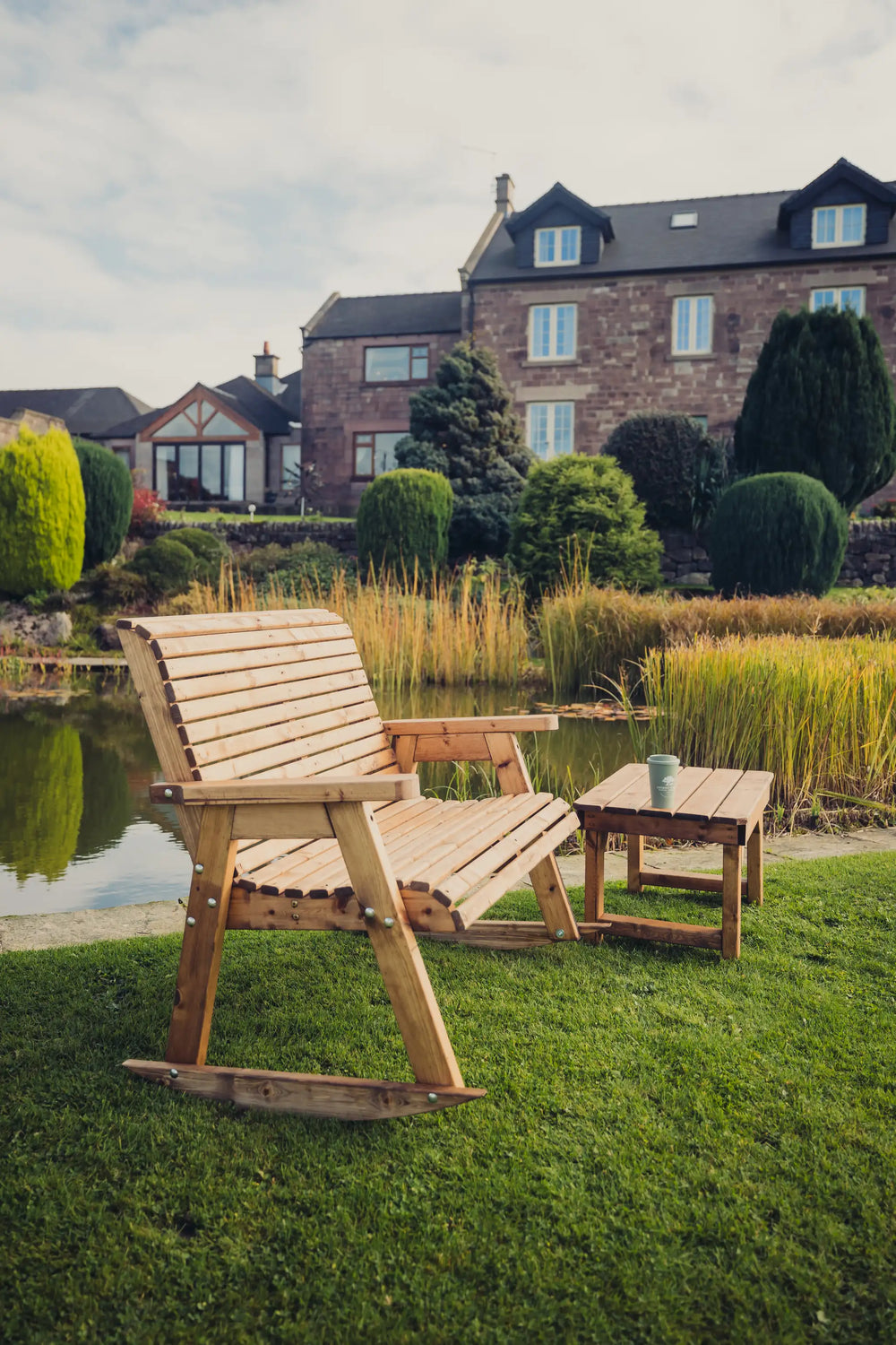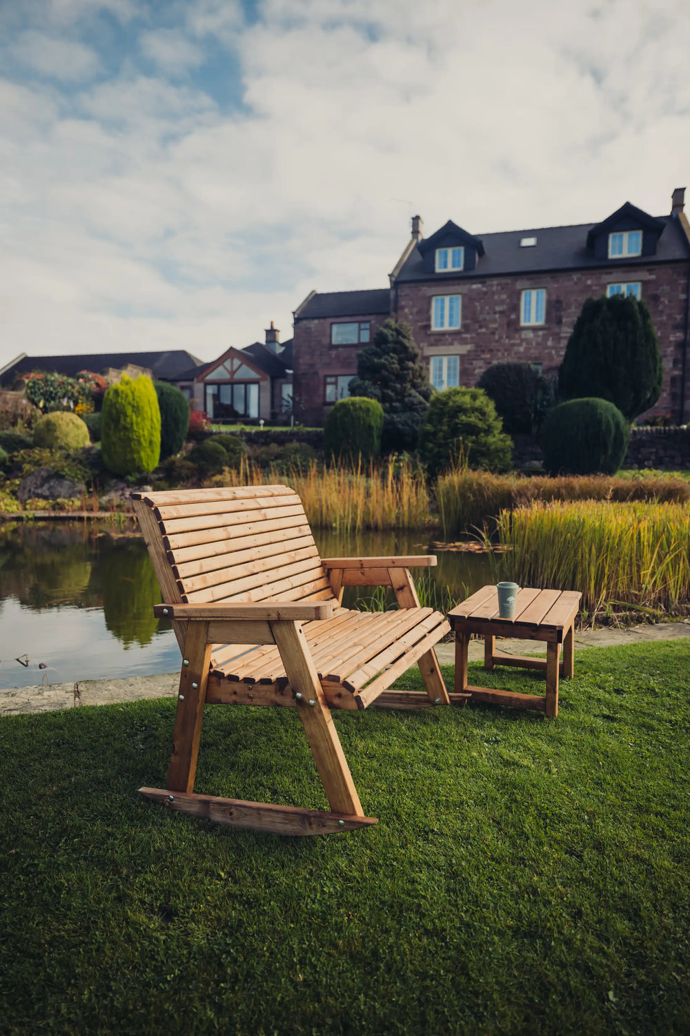 The Valley Rocking Bench is designed with comfort and relaxation in mind. It has a beautiful golden oak finish that will add natural charm to any outdoor space. The chair is ideal for taking time out with a friend or family member to enjoy your surroundings, catch up and watch the world go by. Made from the finest FSC certified Swedish Redwood. This product has been treated with a base coat for protection, ensuring long-lasting durability. To maintain its condition and protect against rot, we recommend re-treating the wood annually. Please note seat cushions are not included and can be purchased separately.