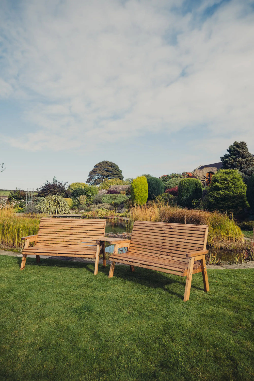 The Valley 6 SEATER Set is designed with comfort and durability in mind. It has a beautiful golden oak finish that will add natural charm to any outdoor space. The set consists of 2 x three seater benches and comes with a handy ANGLED tray that rests on the arms connecting the benches together. The tray lifts on and off with ease allowing you the freedom to relocate the chairs easily in your garden. Made from the finest FSC certified Swedish Redwood. This product has been treated with a base coat for protection, ensuring long-lasting durability. To maintain its condition and protect against rot, we recommend re-treating the wood annually. Please note seat cushions are not included and can be purchased separately.