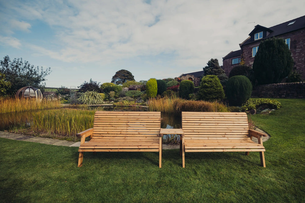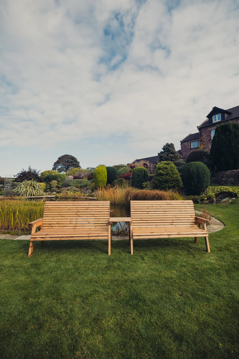 The Valley 6 SEATER Set is designed with comfort and durability in mind. It has a beautiful golden oak finish that will add natural charm to any outdoor space. The set consists of 2 x three seater benches and comes with a handy STRAIGHT tray that rests on the arms connecting the benches together. The tray lifts on and off with ease allowing you the freedom to relocate the chairs easily in your garden. Made from the finest FSC certified Swedish Redwood. This product has been treated with a base coat for protection, ensuring long-lasting durability. To maintain its condition and protect against rot, we recommend re-treating the wood annually. Please note seat cushions are not included and can be purchased separately.