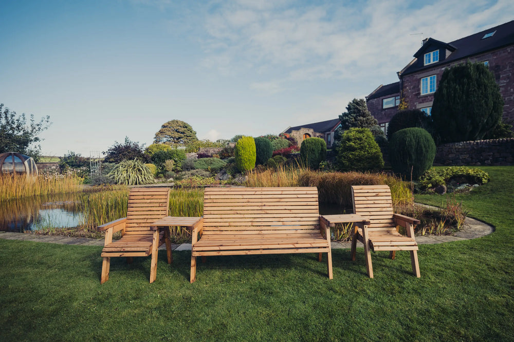 The Valley 5 SEATER Set is designed with comfort and durability in mind. It has a beautiful golden oak finish that will add natural charm to any outdoor space. The set consists of 1 x three seater bench and 2 x chairs and comes with handy STRAIGHT trays that rests on the arms connecting the chairs and benches together. The tray lifts on and off with ease allowing you the freedom to relocate the chairs easily in your garden. Made from the finest FSC certified Swedish Redwood. This product has been treated with a base coat for protection, ensuring long-lasting durability. To maintain its condition and protect against rot, we recommend re-treating the wood annually. Please note seat cushions are not included and can be purchased separately.
