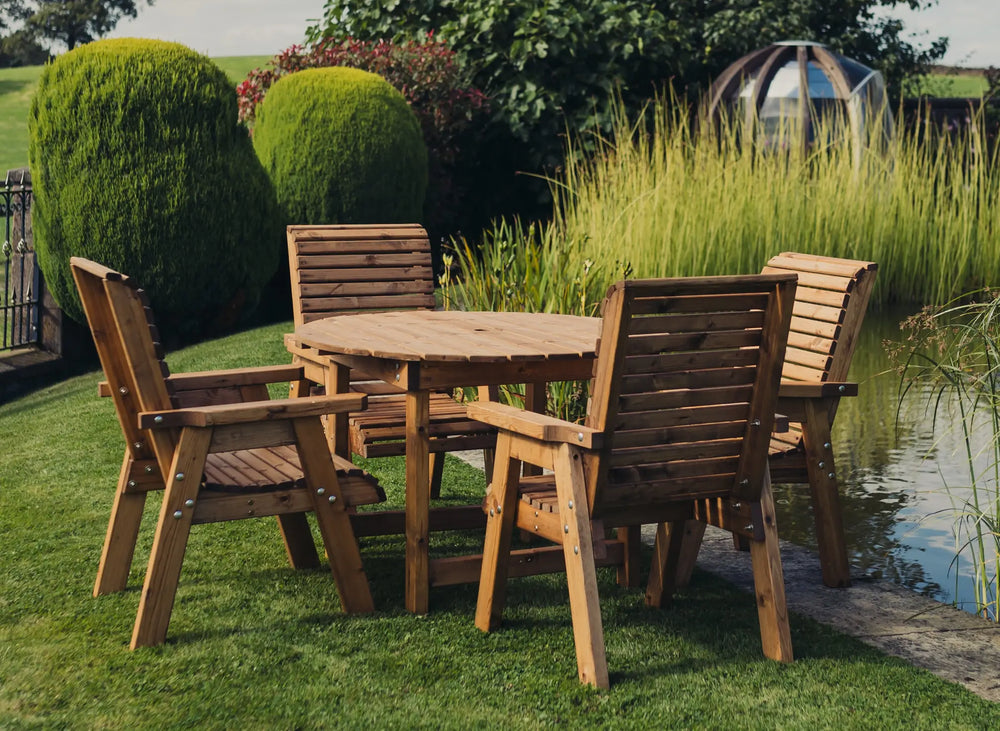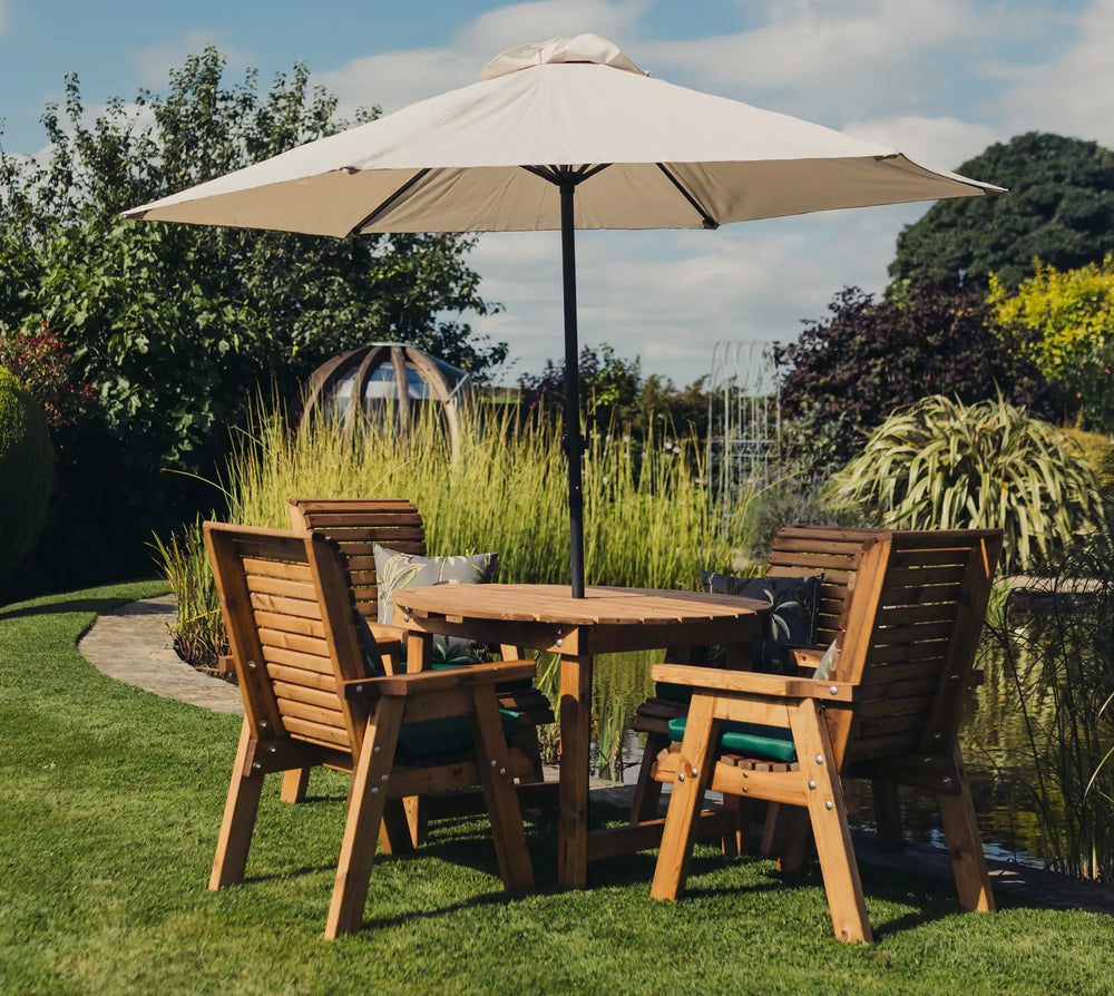 This Valley Table Set seats 4 and is designed with style, comfort and durability in mind. It has a beautiful golden oak finish that will add natural charm to any outdoor space. The set consists of a round table and 4 chairs. Made from the finest FSC certified Swedish Redwood. This product has been treated with a base coat for protection, ensuring long-lasting durability. To maintain its condition and protect against rot, we recommend re-treating the wood annually. Please note seat cushions are not included and can be purchased separately.