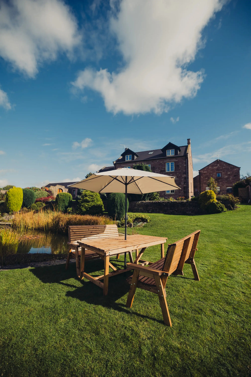 This Valley Table Set seats 4 and is designed with style, comfort and durability in mind. It has a beautiful golden oak finish that will add natural charm to any outdoor space. The set consists of a rectangle table and 2 x two seater benches. Made from the finest FSC certified Swedish Redwood. This product has been treated with a base coat for protection, ensuring long-lasting durability. To maintain its condition and protect against rot, we recommend re-treating the wood annually. Please note seat cushions are not included and can be purchased separately.