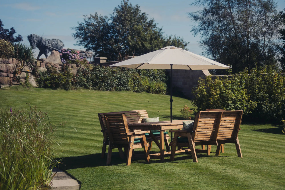 This Valley Table Set seats 10 and is designed with style, comfort and durability in mind. It has a beautiful golden oak finish that will add natural charm to any outdoor space. The set consists of a rectangle table and 2x two seater bench and 2 x 3 seater benches. Made from the finest FSC certified Swedish Redwood. This product has been treated with a base coat for protection, ensuring long-lasting durability. To maintain its condition and protect against rot, we recommend re-treating the wood annually. Please note seat cushions are not included and can be purchased separately.