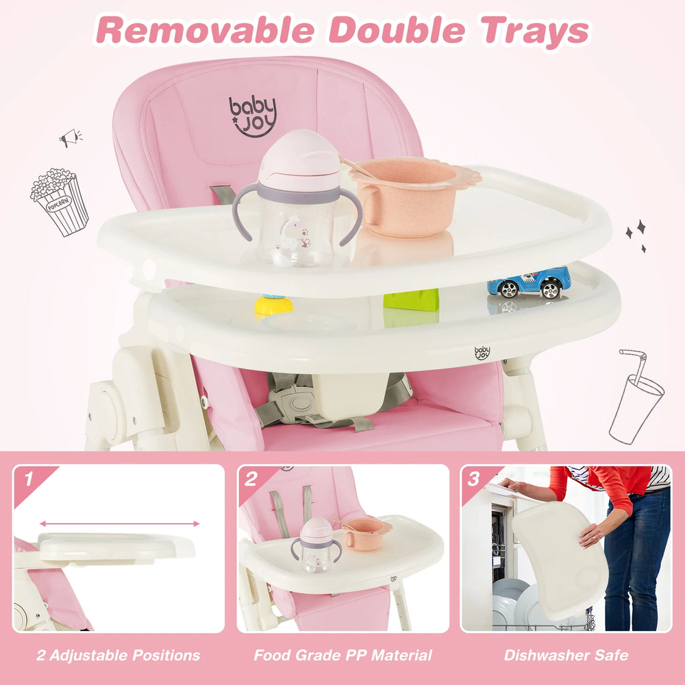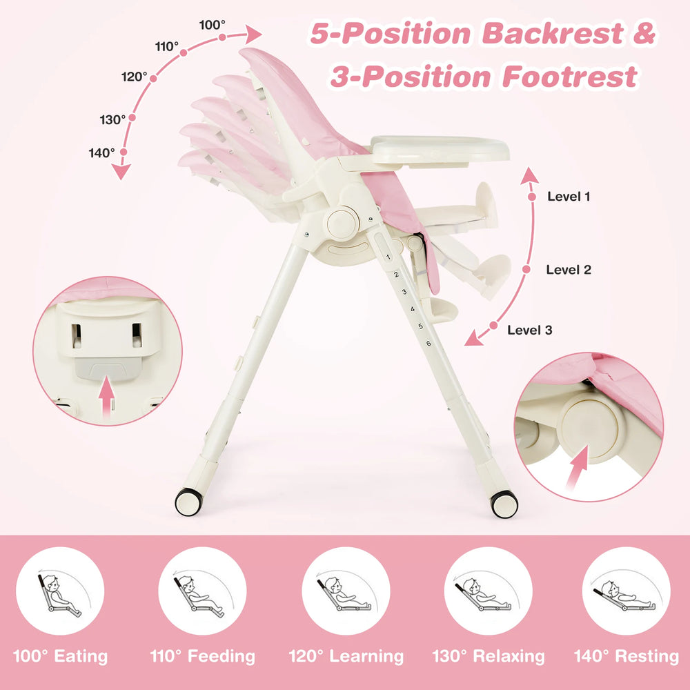 4-in-1 Foldable Baby High Chair with 6 Adjustable Heights and 5-Position Backrest-Pink