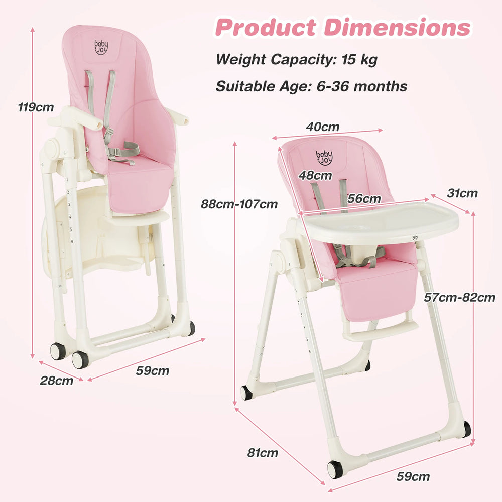 Colour: Pink + White Material: Aluminum Alloy + PP + Fabric Unfold Dimension: 81 cm x 59 cm x 107 cm (L x W x H) Folding Dimension: 59 cm x 28 cm x 119 cm (L x W x H) Adjustable Height Range: 88-107 cm Weight Capacity: 15 kg Suitable Age: 6-36 months Net Weight: 7 kg Box QTY: 1(May vary by batch) Package includes: 1 x Baby High Chair 1 x Instrcution Manual