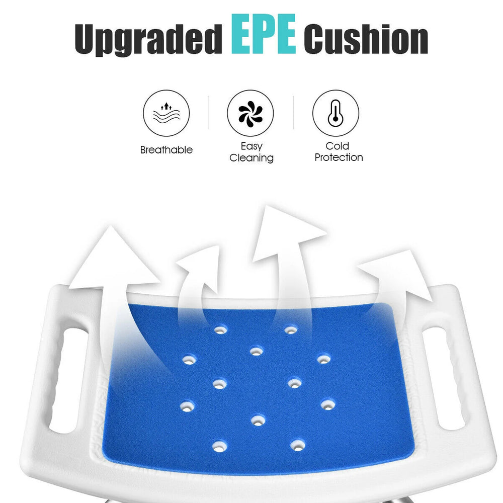 This adjustable shower stool gives safe, comfortable seating for people who need support while bathing. The curve-shaped seat features an EPE foam pad for cushioning and built-in drainage holes to help water flow away, reducing slippage. Built-in seat handles make it easy to reposition the stool.