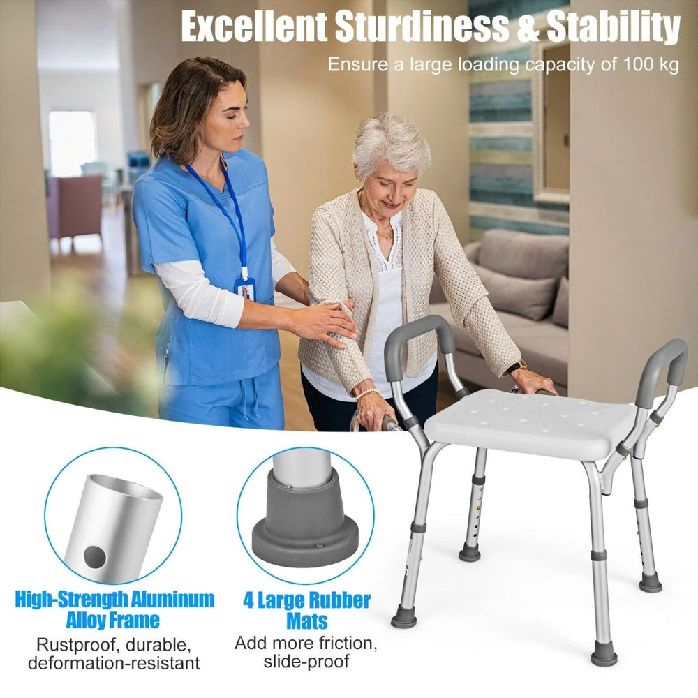 This height-adjustable bath chair gives secure, comfortable seating for bathing in showers or tubs. Its heavy-duty anodized aluminium alloy frame is rust-resistant and deformation‑resistant, while large rubber feet add friction and stability on wet surfaces. The textured plastic seat has drainage holes to prevent water pooling and reduce slipping.