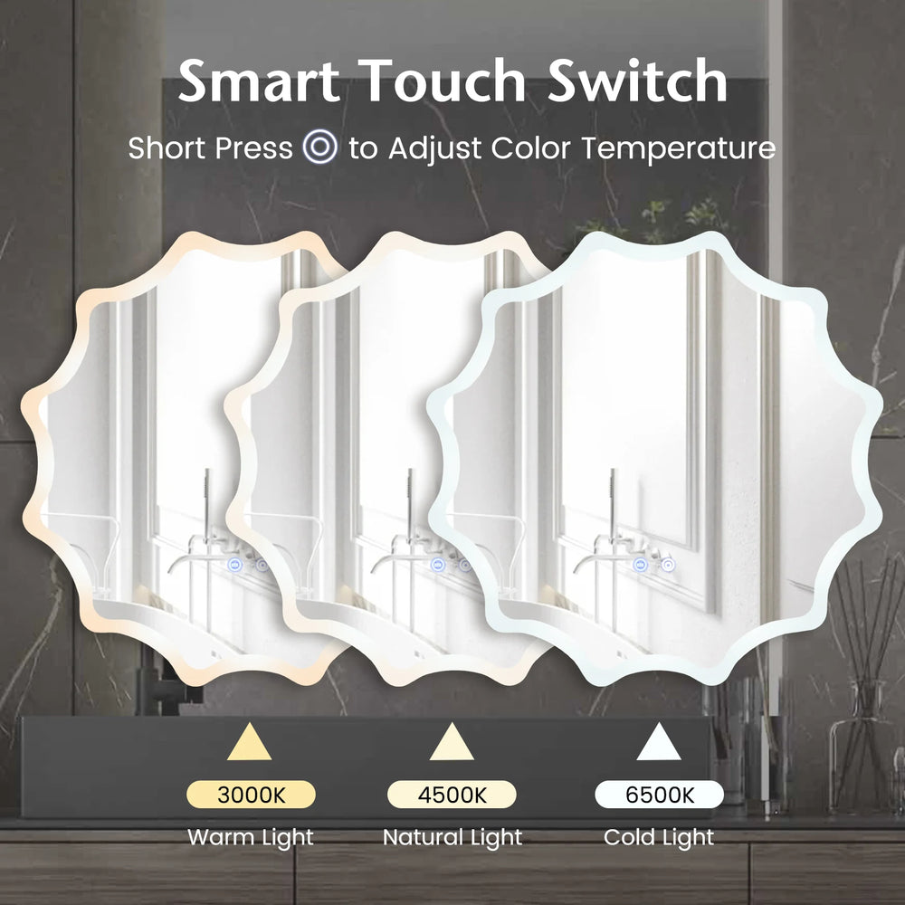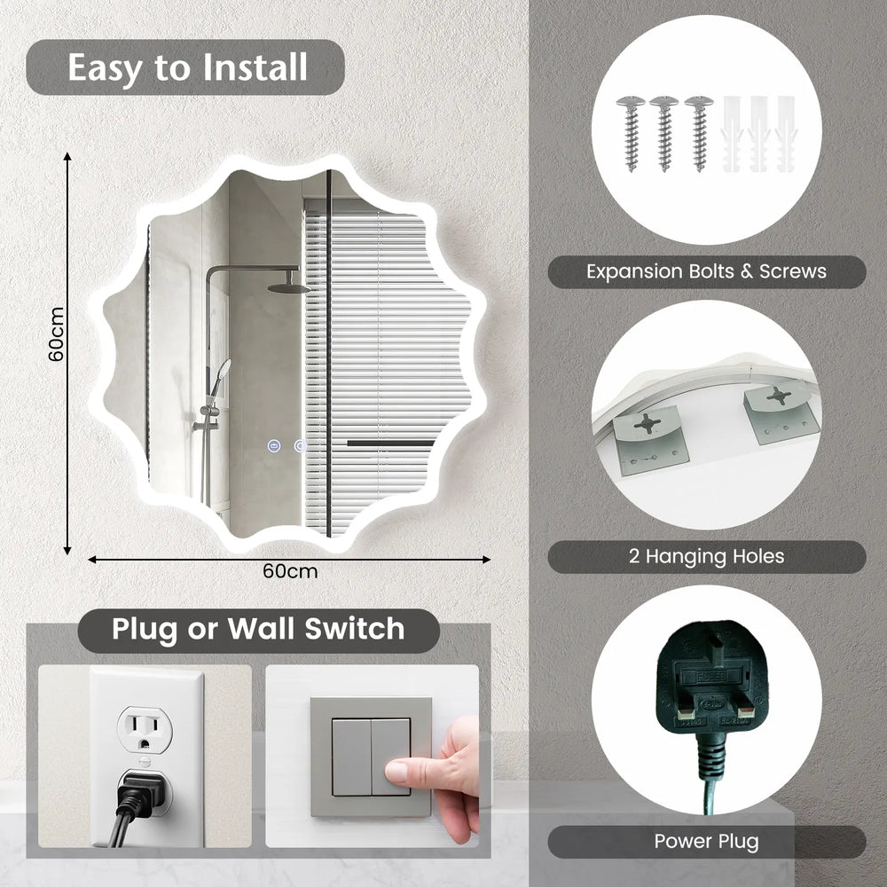 Color: Silver Material: Glass, Aluminum Alloy Power: 220-240V Frequency: 50-60Hz Product Dimension: 60 cm x 60 cm (L x W) Power Cord Length: 120 cm Shape: Waved Edge Net Weight: 4 kg Gross Weight: 5 kg Package Includes: 1 x Wall Mounted LED Mirror 1 x Instruction