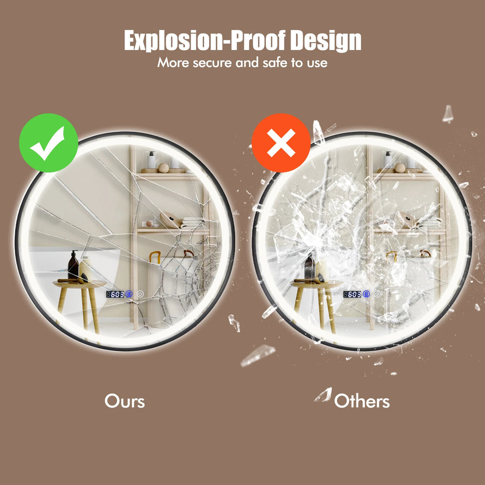 Designed to enhance your bathroom viewing experience, with anti-fog technology, this mirror ensures a clear vision even in the steamiest bathrooms, providing you with a hassle-free grooming routine. Moreover, the mirror features three color temperature options: 3000K warm light, 4500K natural light, and 6500K white light, which can be easily adjusted to create the desired ambiance in your bathroom. Moreover, say goodbye to the hassle of readjusting your settings every time with the mirror's built-in memory function. It saves and recalls your preferred brightness and color settings, simplifying your routine and saving you time and effort. Besides that, this mirror features an explosion-proof design to ensure a secure and safe using experience. Furthermore, the sturdy expansion screws guarantee a stable and reliable installation, so that it can stand the test of time. Say goodbye to foggy mirrors and enjoy clear vision, personalized lighting, and ease of use. If you are looking for a Bathroom Mirror like this, do not hesitate to place an order! Anti-Fog Function: This mirror is equipped with advanced anti-fog technology that ensures a clear vision even in steamy bathrooms, providing you with a hassle-free grooming experience. Unlike others, this mirror offers one-touch start and automatic shut off, you can even long press the button to enter set the defogging time. 3 Color Temperature Adjustment: Elevate your grooming routine with the mirror's three-color temperature options: 3000K warm light, 4500K natural light, and 6500K white light. Furthermore, with a short press to adjust the color and a long press to adjust the brightness, you can choose the perfect lighting to suit your needs and create the desired ambiance in your bathroom. Built-In Memory Function: With this mirror's built-in memory function, you can easily save and recall your preferred brightness and color settings every time you use it. So this smart bathroom mirror can save you time and effort. Explosion-Proof Design: Designed with safety in mind, the mirror features an explosion-proof design that provides extra protection and ensures a more secure and safe use. Additionally, our mirror is built to withstand daily use and protect against shattering. Sturdy Installation: Installing the mirror is a breeze. Featuring sturdy expansion screws that guarantee a stable and reliable installation, this mirror can be securely fixed to the bathroom wall.