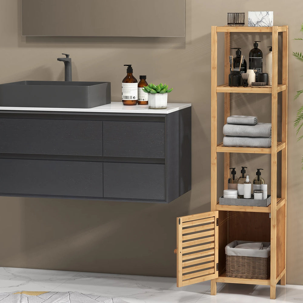 Bathroom shelf bamboo standing shelf with 4 levels of shelves and louvre door 34 x 33 x 140 cm natural