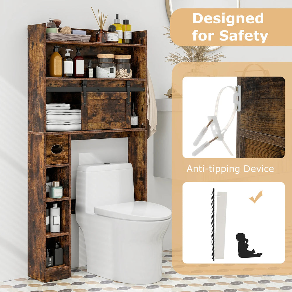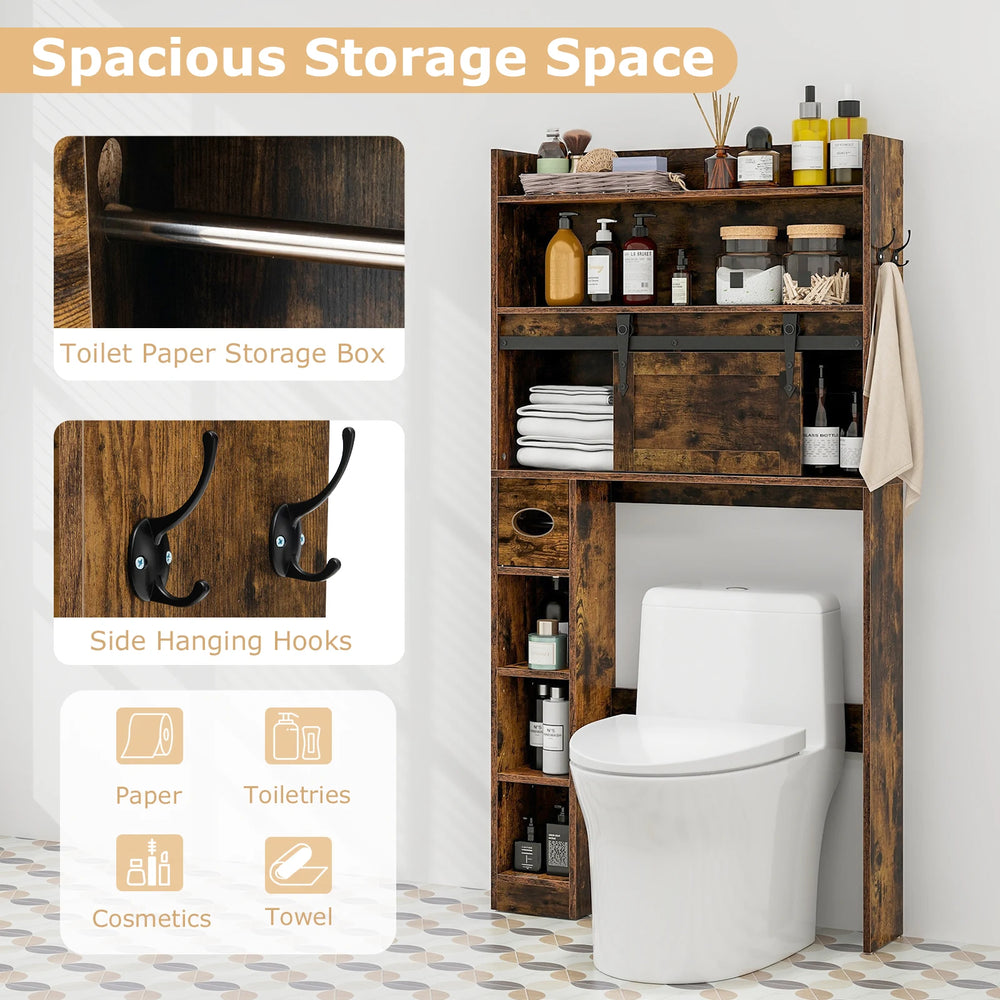 Over The Toilet Storage Cabinet with Sliding Barn Door and Adjustable Shelves-Rustic Brown