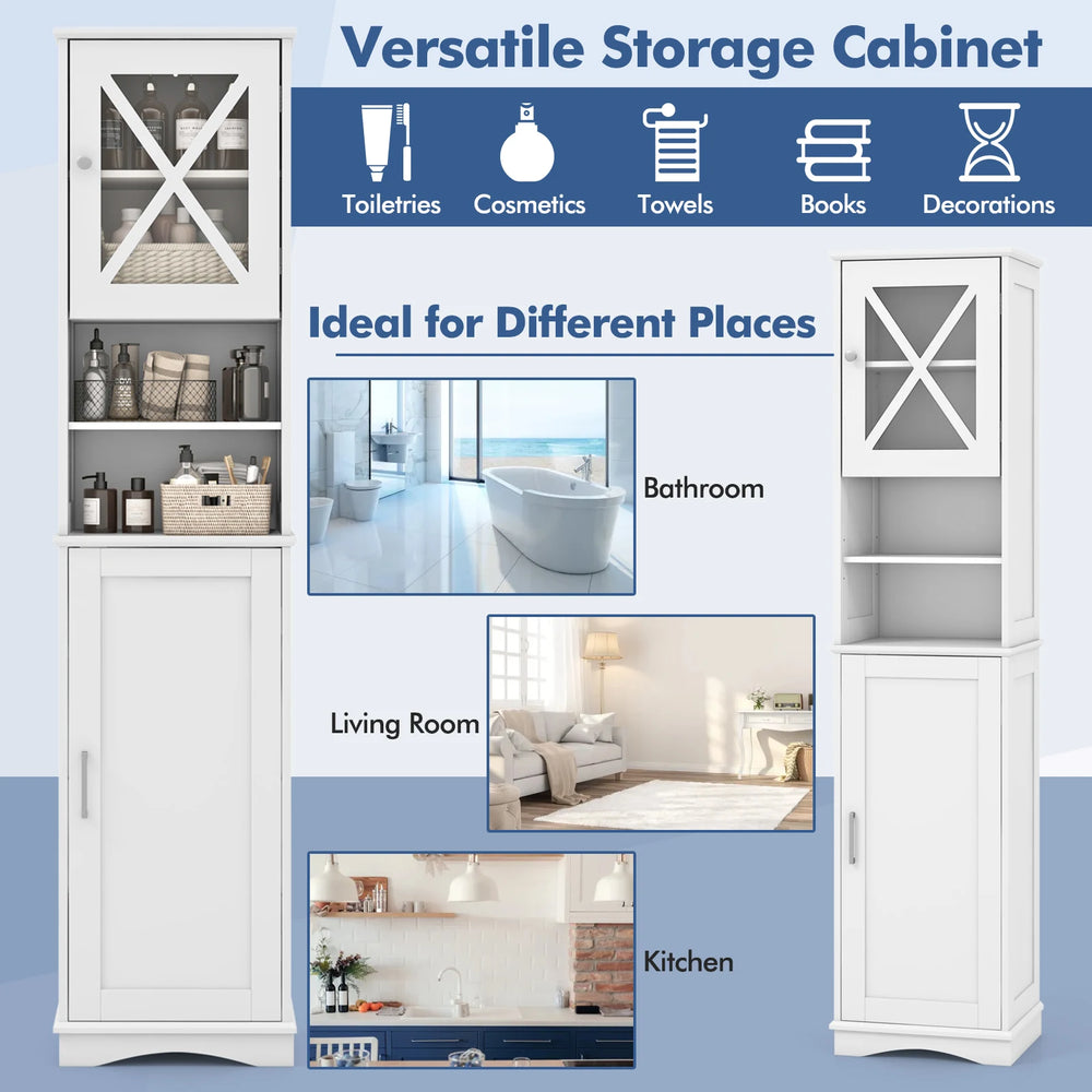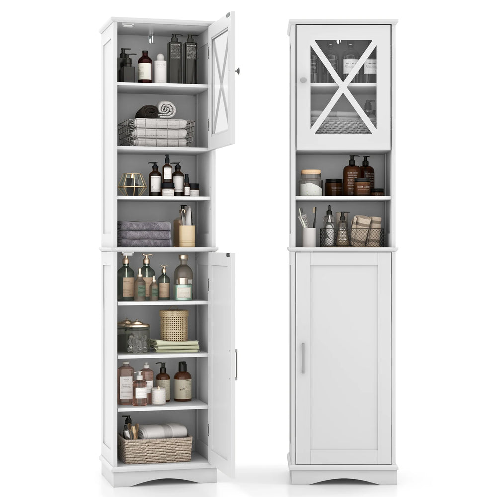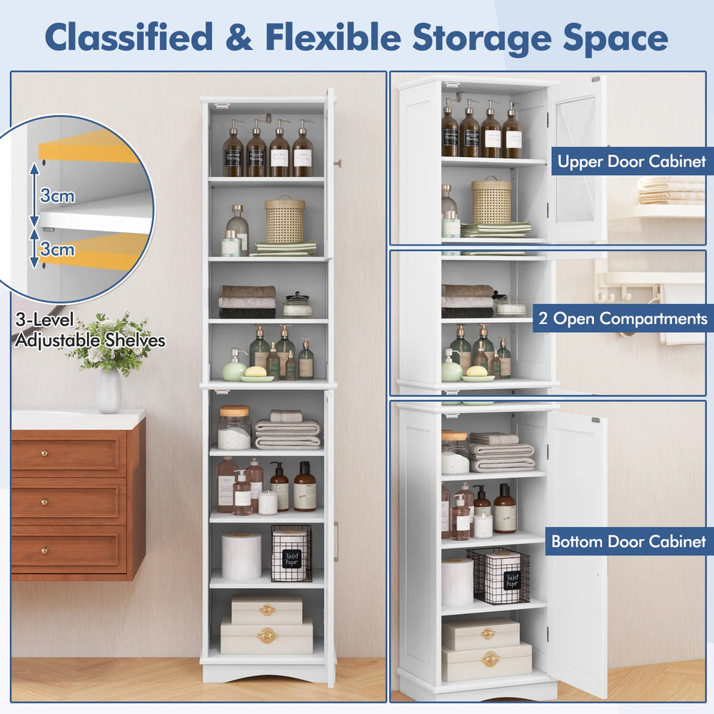 Featuring 2 open compartments and 2 enclosed cabinets, it offers ample space for your daily essentials. The floor cabinet also includes 5 adjustable and removable shelves, allowing for customization to fit items of various sizes. Crafted from premium acrylic panel and MDF with water-resistant paint, it ensures long-lasting durability. Additionally, the anti-toppling device enhances stability and safety. Its compact design effortlessly fits into narrow corners, making it ideal for bathrooms, living rooms, kitchens, home offices, and more. Upgrade your space with this practical corner floor cabinet. Bullet Point:Spacious Storage Options: This tall bathroom cabinet offers sufficient storage for tight space. The 2 open compartments are suitable for displaying decorative items, or housing frequently used items, while the 2 enclosed cabinets are ideal for storing towels, toiletries, cleaning supplies, and extra bathroom products. Customizable Shelving: The corner floor cabinet features 5 adjustable shelves that can be removed or adjusted to 3 heights. It allows for easy customization to fit items of various sizes, ensuring maximum efficiency and organization for your specific needs. Compact Design for Small Spaces: Measuring 40 x 30 x 170.5 cm (L x W x H), this freestanding high cabinet takes up little floor space and fits effortlessly into narrow corners. Its compact design saves space without compromising on storage capacity, making it ideal for small rooms. Reliable Construction: Crafted from premium acrylic panel and MDF with water-resistant paint, the bathroom floor cabinet is built to last. Additionally, the anti-toppling device provides greater stability and safety, preventing accidental falls for worry-free use. Versatile Use: The simple design adds a touch of style to your living space. Beyond the bathroom, this slim storage cabinet is suitable for various spaces such as living rooms, kitchens, or home offices, providing convenient storage solutions wherever needed. Specifications:Colour: Grey/ WhiteMaterials: MDF, Acrylic BoardOverall Dimensions: 40 x 30 x 170,5 cm (L x W x H)Adjustable Height of Shelf: 3 cmWeight Capacity of Each Shelf: 10 kgNet Weight: 20 kg Package Includes:1 x Bathroom Floor Cabinet1 x Instruction Manual
