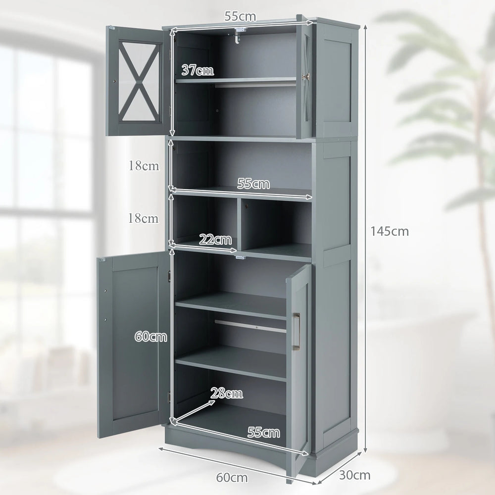 Transform your bathroom into an organized place with this spacious and versatile bathroom cabinet. Say goodbye to clutter with a top cabinet, a large compartment, 2 open shelves, and a 2-door cabinet, providing ample storage space for towels, toiletries, cosmetics, and more. The 3 adjustable shelves in cabinet make it convenient to accommodate items of different sizes (3 cm for each level). Crafted from premium MDF, this cabinet is stable and wear-resistant. Unlike others are vulnerable to hazard, ours is child and pet friendly. Thanks to the stable widened base, this cabinet minimizes wobbling. Safety is a top priority with 2 anti-tipping devices included for wall attachment. The upper cabinet features acrylic doors for high transparency and rustic charm, while the smooth and waterproof surface ensures effortless cleaning. Elevate your space with the modern design that complements any decor, making this cabinet suitable for use in bathrooms, living rooms, studies, or kitchens. Bullet Point: Large Storage Cabinet: This large bathroom cabinet has 1 upper cabinet, 3 open shelves and 1 lower cabinet. The large storage cabinet can easily categorize towels, tissue, cosmetics, skin care products and shampoo, keeping your bathroom free from clutter. 3 Adjustable Shelves: The cabinet has 3 adjustable shelf inside, and each shelf has three adjustable positions, allowing you to place items at different heights. You can also simply remove the shelves for larger storage space. Stable and Safe to Use: Crafted of premium MDF, this tall cupboard cabinet offers great durability for long-time use. The stabilized base adds steadyness and reduces any unwanted wobbling. In addition, the sideboard is equipped with 2 safety anti-tipping devices to help secure it to the wall. Thoughtful Details: The upper cabinet of the storage unit is equipped with farmhouse style acrylic doors, making it convenient for you to view the interior of the cabinet. Convenient handles and metal hinges allow for easy access to items. Moreover, our cabinet has a smooth and waterproof surface that is easy to clean. Specifications: Color: White/Grey Material: MDF, Acrylic Overall Dimensions: 60 x 30 x 145 cm (L x W x H) Interior Dimensions of Upper Cabinet: 55 x 27.5 x 36.5 cm (L x W x H) Interior Dimensions of Large Cube: 55 x 27.5 x 17.5 cm (L x W x H) Interior Dimensions of Small Cube: 22 x 27.5 x 17.5 cm (L x W x H)) Interior Dimensions of Lower Cabinet: 55 x 27.5 x 60 cm (L x W x H) Total Weight Capacity: 45 kg Net Weight: 26 kg Package includes: 1 x Bathroom Cabinet 1 x User Guide
