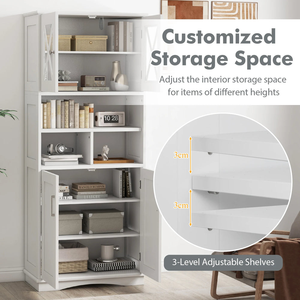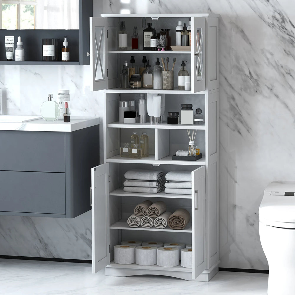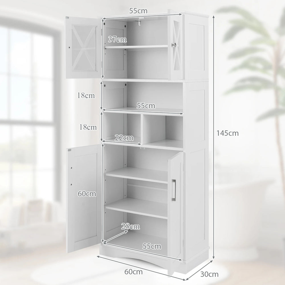 Transform your bathroom into an organized place with this spacious and versatile bathroom cabinet. Say goodbye to clutter with a top cabinet, a large compartment, 2 open shelves, and a 2-door cabinet, providing ample storage space for towels, toiletries, cosmetics, and more. The 3 adjustable shelves in cabinet make it convenient to accommodate items of different sizes (3 cm for each level). Crafted from premium MDF, this cabinet is stable and wear-resistant. Unlike others are vulnerable to hazard, ours is child and pet friendly. Thanks to the stable widened base, this cabinet minimizes wobbling. Safety is a top priority with 2 anti-tipping devices included for wall attachment. The upper cabinet features acrylic doors for high transparency and rustic charm, while the smooth and waterproof surface ensures effortless cleaning. Elevate your space with the modern design that complements any decor, making this cabinet suitable for use in bathrooms, living rooms, studies, or kitchens. Bullet Point: Large Storage Cabinet: This large bathroom cabinet has 1 upper cabinet, 3 open shelves and 1 lower cabinet. The large storage cabinet can easily categorize towels, tissue, cosmetics, skin care products and shampoo, keeping your bathroom free from clutter. 3 Adjustable Shelves: The cabinet has 3 adjustable shelf inside, and each shelf has three adjustable positions, allowing you to place items at different heights. You can also simply remove the shelves for larger storage space. Stable and Safe to Use: Crafted of premium MDF, this tall cupboard cabinet offers great durability for long-time use. The stabilized base adds steadyness and reduces any unwanted wobbling. In addition, the sideboard is equipped with 2 safety anti-tipping devices to help secure it to the wall. Thoughtful Details: The upper cabinet of the storage unit is equipped with farmhouse style acrylic doors, making it convenient for you to view the interior of the cabinet. Convenient handles and metal hinges allow for easy access to items. Moreover, our cabinet has a smooth and waterproof surface that is easy to clean. Specifications: Color: White/Grey Material: MDF, Acrylic Overall Dimensions: 60 x 30 x 145 cm (L x W x H) Interior Dimensions of Upper Cabinet: 55 x 27.5 x 36.5 cm (L x W x H) Interior Dimensions of Large Cube: 55 x 27.5 x 17.5 cm (L x W x H) Interior Dimensions of Small Cube: 22 x 27.5 x 17.5 cm (L x W x H)) Interior Dimensions of Lower Cabinet: 55 x 27.5 x 60 cm (L x W x H) Total Weight Capacity: 45 kg Net Weight: 26 kg Package includes: 1 x Bathroom Cabinet 1 x User Guide