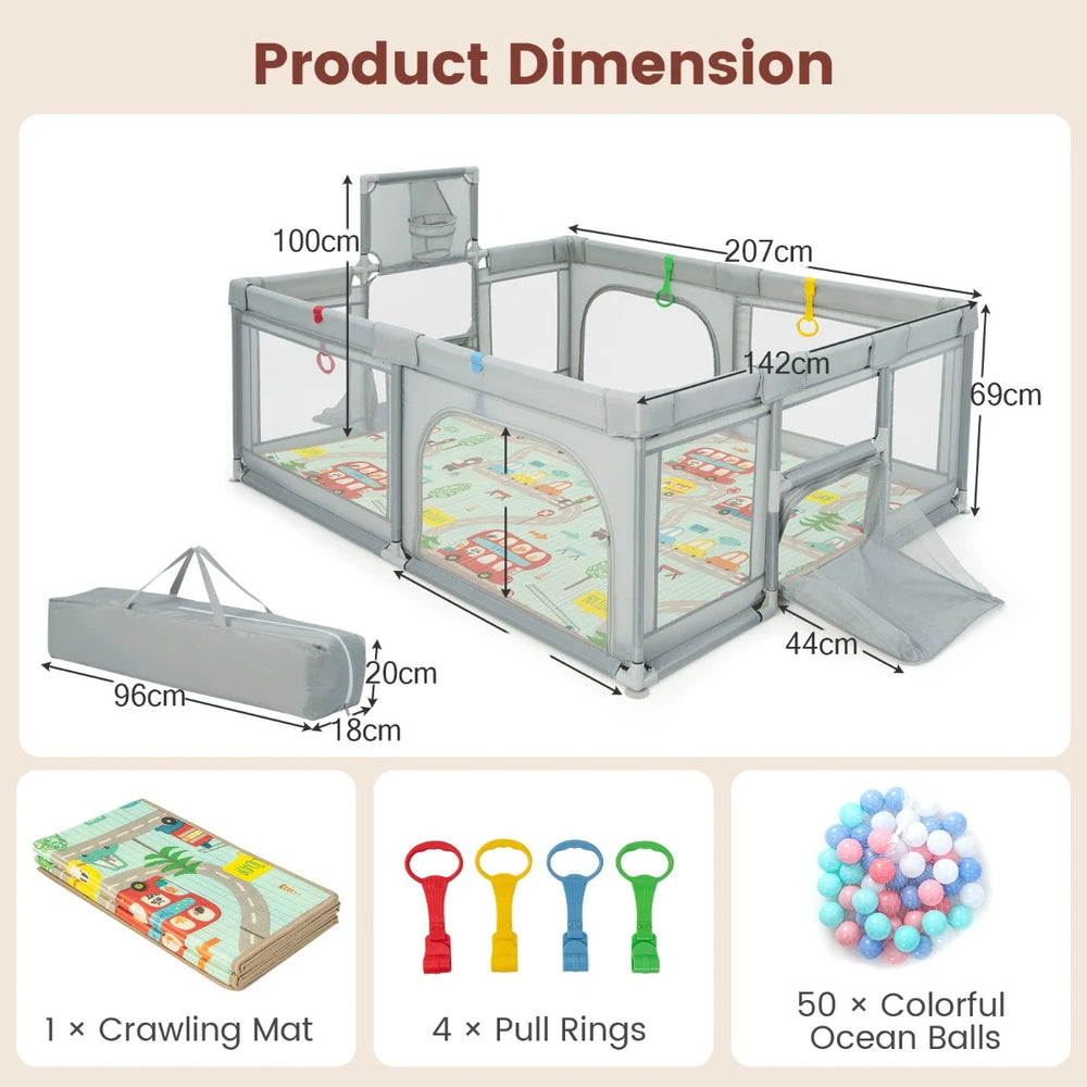 Colour: Light Gray, Dark Gray Material: Oxford Fabric, XPE, Metal, PP Overall Dimension(Without Basketball Hoop or Soccer Net): 207 cm x 142 cm x 68 cm (L x W x H) Size of Each Soccer Net: 44 cm x 44 cm x 34 cm(L x W x H) Height with Basketball Hoop: 100 cm Size of the Baby Mat: 196 cm x 139 cm(L x W) Size of the Carrying Bag: 96 cm x 20 cm x 18 cm(L x W x H) Applicable Age: 0-3 Years Old Net Weight: 9 kg Box qty: 1 Package includes: 1 x Baby Playpen 50 x Ocean Balls 4 x Pull Rings 1 x Instruction manual