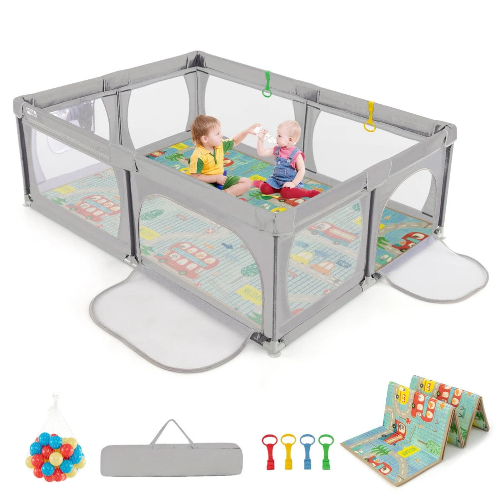 Baby Playpen with Mat and 4 Pull Rings -Light Grey