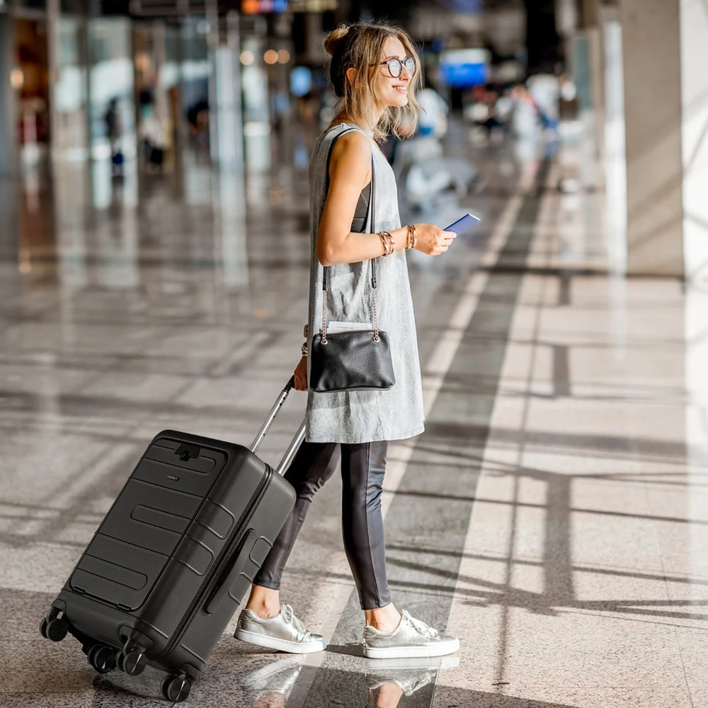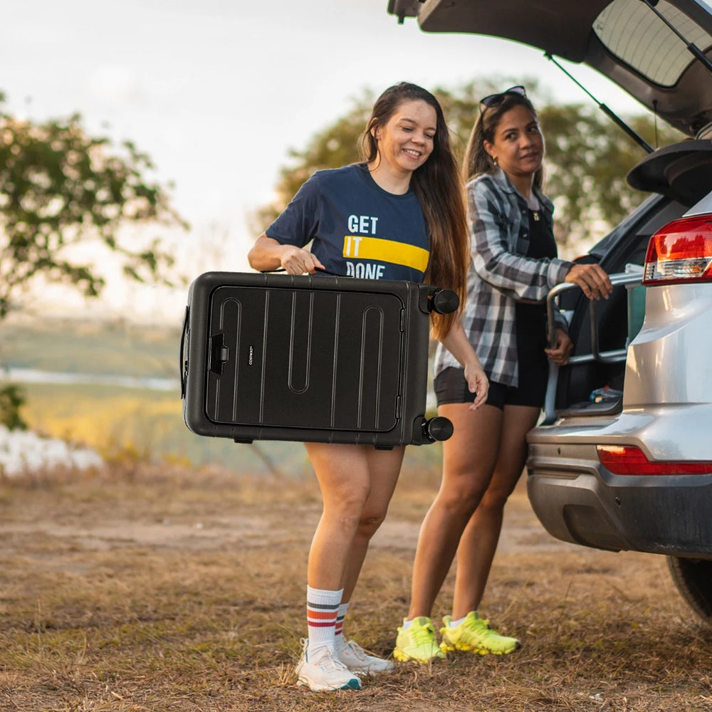 Color: Black Material: PC, aluminum Overall dimensions: 14" x 9" x 21.5" (L x W x H) Size of the foldable tabletop: 8.5" x 9" (L x W) 4 Adjustable heights: 35.5", 37.5", 39.5", 41.5" Weight capacity of tabletop: 5.5 lbs Packing capacity: 38L Net weight: 8 lbs Package included: 1 x Carry-on luggage 1 x User’s manual