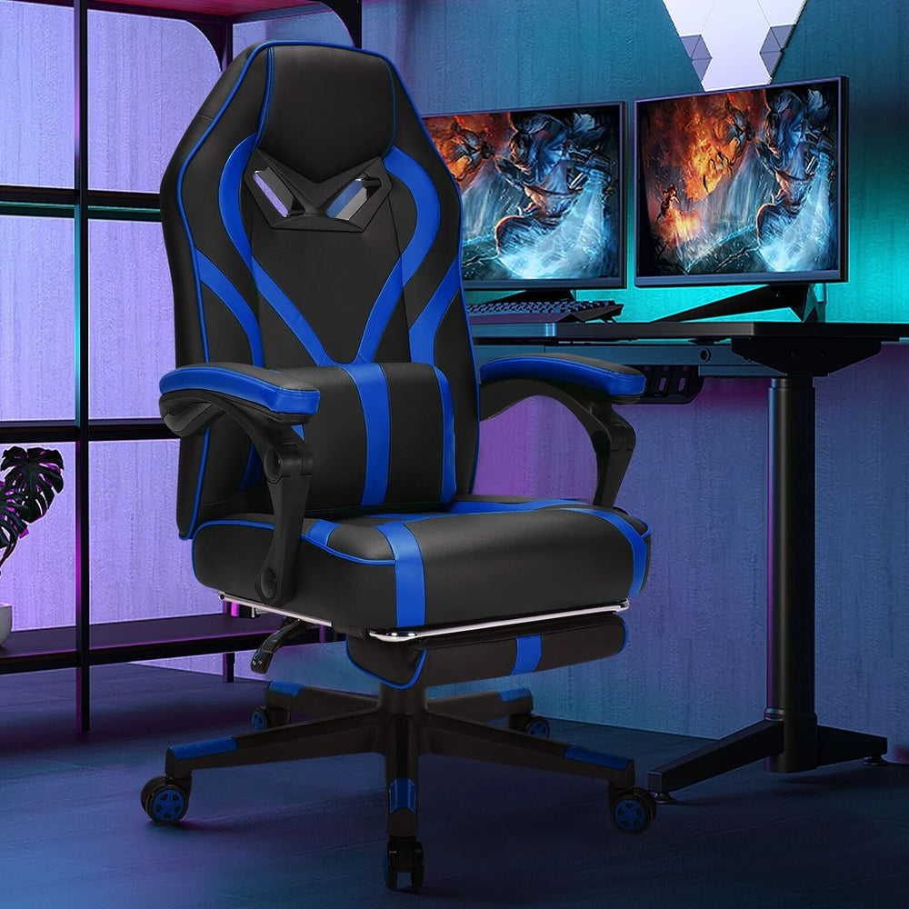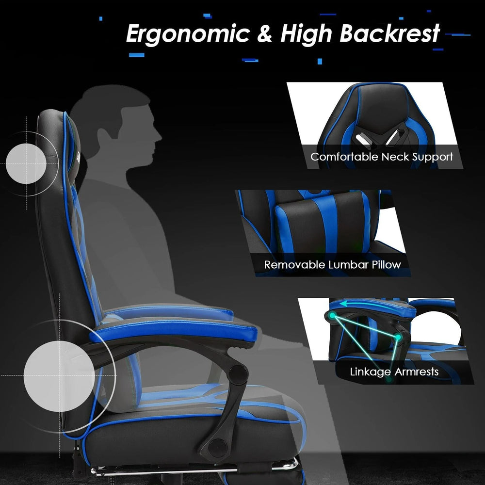 Ergonomic Swivel Gaming Chair with Retractable Footrest and Lumbar Support-Blue