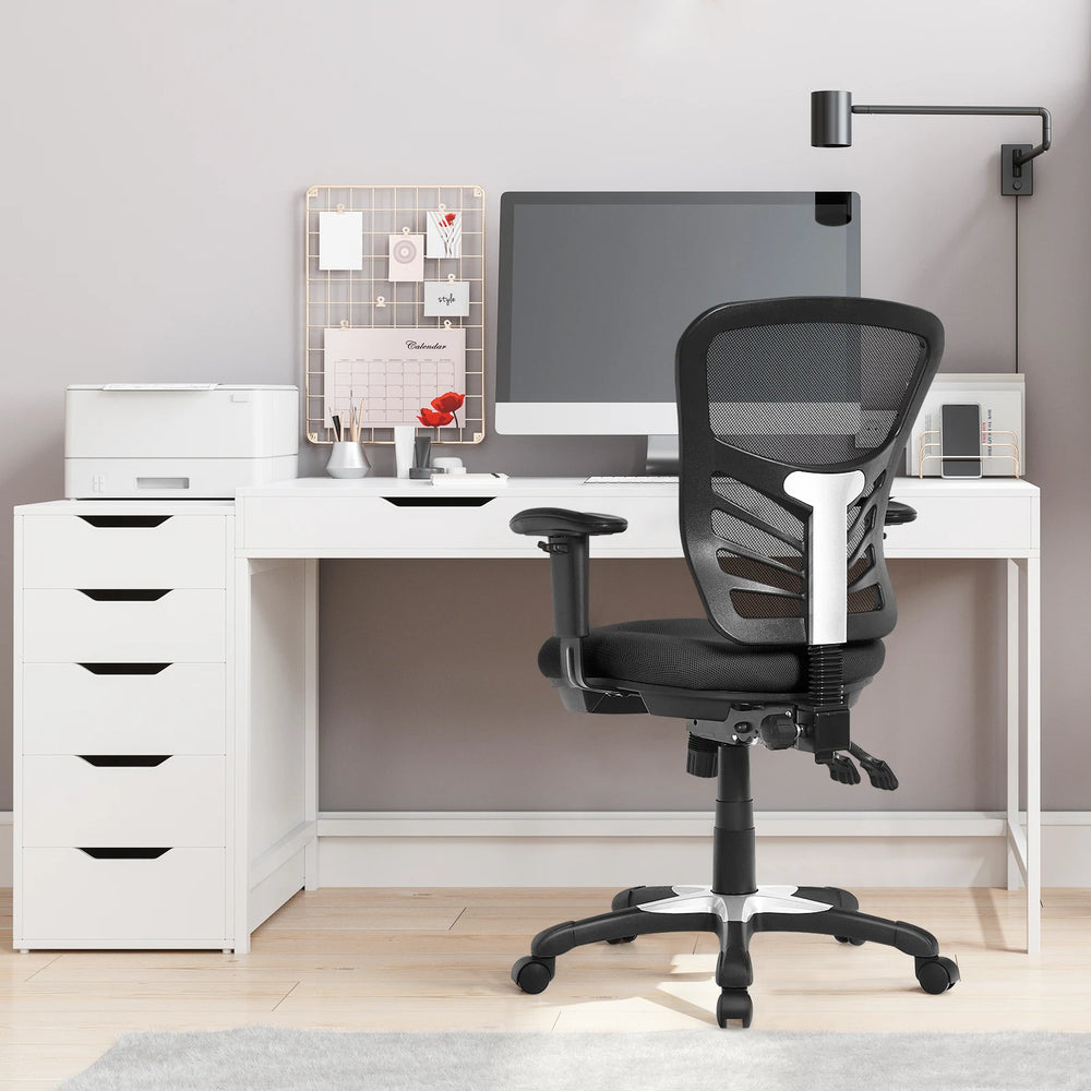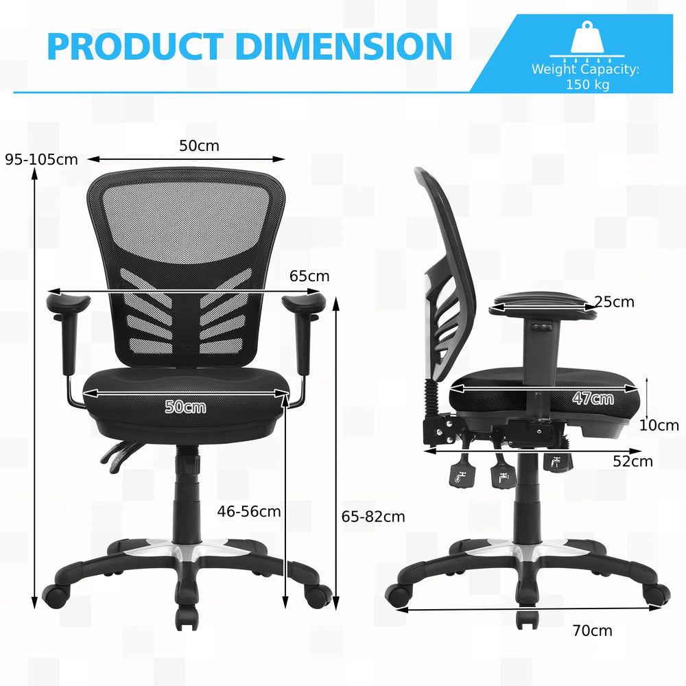 Get this office chair and enjoy the high-efficient work! This executive chair is highly adjustable. The reclining backrest can be tilted from 110-125 and the height of backrest can be independently adjusted within the range of 6 cm. Meanwhile, you can choose the seat height from 46 to 56 cm . This customized design is dedicated to providing you with the most comfortable sitting experience on any occasion, relieving fatigue and improving working efficiency. More importantly, the ergonomic seat cushion with sunken hip shape will better fit your hip and give you long-time relaxing sitting. Curved backrest also accurately supports your back and waist and reduce body pains and aches. Assembly Video https://www.youtube.com/watch?v=97yyB5MNTXw Bullet Point: Full Flexibility: Our office chair features diverse adjustable designs that allow you to adjust a unique chair to suit your needs. Thanks to 10 cm chair height adjustment and 6 cm armrest height adjustment, the chair is suitable for people of different sizes. Plus, 15 tiltable back and 10 tiltable seat make your leisure time more relaxing. Ergonomic Design: With streamlined design, the backrest fits closely to your back curve. In addition to this, the backrest is also equipped with a sturdy lumbar support that provides you with ample waist support. Both features will effectively relieve your physical pain around back and waist. Comfortable Material: Both backrest and cushion are made of breathable mesh fabric offering you more comfortable experience. The cushion is also filled with high-density sponge which perfectly conforms to your hip curve and distribute pressure. Plus, the armrests are covered with soft premium PU for refreshing touch. Great Sturdiness & Convenient Movement: Equipped with strong and durable gas rod, the office chair is excellent in sturdiness and stability. During height adjustment, our premium gas rods will greatly reduce the vibration and make it more smooth. Meanwhile, coming with smooth casters, it is effortless for you to move the chair. Convenient Assembly & Wide Application: With our detailed manual and needed accessories, the assembling process becomes much easier. Also, with minimalist appearance, the complete office chair blends well into diverse occasions. You can place it in office as a working chair, in study as a reading chair or a resting chair. Features: 46-56 cm adjustable height for different people in different occasions Adjustable armrests within 6 cm height range offer more choice to meet your needs Ergonomic seat cushion perfectly fits hip for fatigue relief Height adjustable backrest for people of different heights Mesh backrest achieves both breathable and durable features 10 rocking function provides dynamic comfort Smooth rolling casters for flexible mobility, without hurting the floor 360 swivel design makes it more flexible to use Wide application for home, office and meeting room Specifications: Colour: Black Material: Mesh, PP, PU, Sponge, Metal Overall Dimensions: 64 x 65 x 94-104 cm (L x W x H)) Seat Thickness: 10 cm Weight Capacity: 120 kg Net Weight: 16 kg Package Include: 1 x Mesh Office Chair 1 x User's Guide