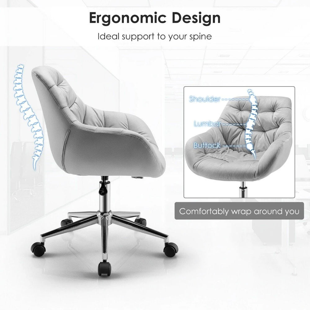 Are you looking for a comfortable and fancy desk chair? Why not give our velvet desk chair a glance? The ergonomic mid-back office chair is covered with soft and delicate velvet fabric, which is embellished with tufted patterns for a luxury feel. Meanwhile, the leisure armchairs seat is rather comfortable with sponge-filling. And the integrated armrests and the curved back comfortably warp around you, giving ergonomic support to your back, waist and hips. Whats more, the accent chair is adjustable in height, which allows users of different heights to find ideal positions. Besides, the sturdy 5-claw base with casters not only provides reliable support but also ensures flexible movement. Thus, the chair is suitable as a computer desk chair, a vanity chair or a reception guest chair. Bullet Point: Tufted Velvet Fabric for Luxury Feel: The tufted velvet fabric is definitely the most eye-catching part of the office chair. Not only does it look luxurious and sophisticated, but this fabric is also skin-friendly and breathable, giving you a comfortable touch. Besides, the exquisite appearance goes well with different room decorations. Comfortable Seat & Ergonomic Design: The leisure armchair is designed to give you optimal comfort. In addition to the soft fabric, the seat is padded with a high-density sponge as well, which will relieve the fatigue of longtime sitting. Meanwhile, the mid-back design together with the armrests creates a comfortable wrap and provides ergonomic support. 9 CM Height Adjustment for Personalized Fit: Equipped with a premium pneumatic cylinder, the swivel chairs seat height can be adjusted from 44 cm to 53 cm to fit different peoples heights. Just lift the lever under the chair up and you can let the seat go up and down. Whats more, the seat can swivel 360 flexibly, allowing you to have an all-around view when sitting. Sturdy 5-Claw Base & Rolling Casters: Another significant feature of the office accent chair is the rolling base in a stable 5-claw shape. As a consequence, the chair can support users of up to 150 kg. And the 5 legs are fitted with universal casters, which allow the chair to move anywhere with ease. Great Compatibility with Various Occasions: The mid-back chair on wheels is a good choice for different rooms and different purposes. It is suitable for the home office as a computer desk chair, for the bedroom as a vanity chair, or for the reception room as a guest chair. Whenever and wherever it can give you the most comfortable experience. Features: Luxurious velvet fabric and tufted surface grab your attention in no time The soft-padded seat gives you a comfortable sitting experience Comfortably wrap around you with curved mid back and integrated armrests The adjustable seat goes up and down from 44 cm to 53 cm as needed Sturdy construction with 5-claw steel base supports up to 150 kg 5 rolling casters enable the chair to move in all directions Can be used as a computer desk chair, a vanity chair or an office guest chair Specification: Colour: Grey Material: Velvet, steel, sponge Overall dimensions: 61 cm x 61 cm x 82-91 cm (L x W x H) Seat dimensions: 41 cm x 36 cm (W x D) Seat height: 44-53 cm Net weight: 8.5 kg Maximum weight capacity: 150 kg Package Includes: 1 x Desk Chair 1 x User Manual