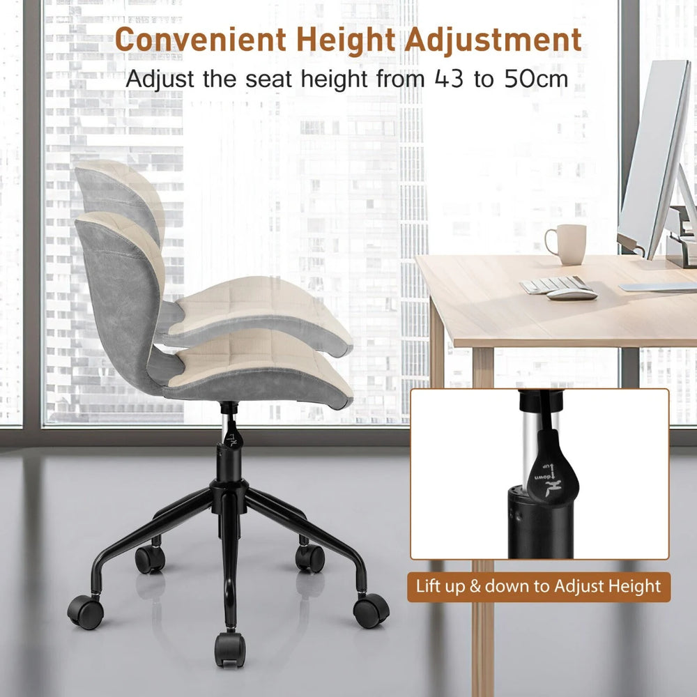 This mid-back swivel chair is what you are looking for to complement your workspace! The combination of linen-finish and premium PU leather makes the chair well adapt to the decorations in office or leisure space. Whats more, the ergonomic seat cushion offers optimal comfort, aiming to relieve fatigue from sitting for long periods of time. Meanwhile, the seat height can be adjusted to meet your needs, while the 5-claw base with casters allows you to move the chair anywhere as you like. In addition, the metal base is very strong and can support a weight of 150kg. Bullet Point: Comfort Comes First: The mid-century modern style chair is not only stylish in look, but also comfortable to sit on. The curved backrest offers ergonomic support to your spine, while the saddle-shaped seat cushion can disperse pressure to relieve fatigue. Meanwhile, the high-resilient padded sponge also brings the comfort to the next level. Ingenious Combo of Linen & Faux Leather: Combined with linen and PU leather, the office desk chair is definitely an eye-catcher to your workspace. Whats more, the linen surface features excellent breathability and wear resistance, being able to serve for a long time. On the other hand, the PU leather is waterproof and thus easy to clean. Height-adjustable Armless Chair: Equipped with a premium pneumatic rod, the armless leisure chair can easily go up from 43cm to 50cm, which is conducive to match the height and posture of different users. Besides, without armrests, you can easily push the chair underneath the desk to save space. Flexible Movement & Easy Assembly: Sitting on the swivel chair with casters, you are free to move in all directions and rotate by 360 degrees. The 5 universal casters roll smoothly and quietly on the floor or carpet. It is also a breeze to put them together! Just insert the casters into the 5-claw base and no extra tool is required. Wide Application: Being well-constructed, the rolling task chair can bear users of a maximum weight up to 150kg. It is widely applicable to students, office stuff and creative workers. In addition, with chic appearance and functional design, the chair can be used in office, study room, as well as bedroom. Features: Ergonomically-designed seat ensures sitting comfort Padded with high-density sponge to relieve fatigue Linen finish is breathable and durable Waterproof PU leather cover is easy to maintain Mid-century modern style caters your taste of chic furnishing Sturdy construction enables the chair to support up to 150kg Universal rolling casters allow flexible movement Can be used in office, study room and bedroom Specifications: Color: Beige + Brown/Beige + Gray Material: Linen, PU, steel, plywood Overall dimensions: 61cm x 61cm x 72-79cm (L x W x H) Net weight: 6.75 kg Seat height: 43-50cm Seat dimensions: 47cm x 45cm (W x D) Weight capacity: 150 kg Package Includes: 1 x Linen Office Chair 1 x Instruction