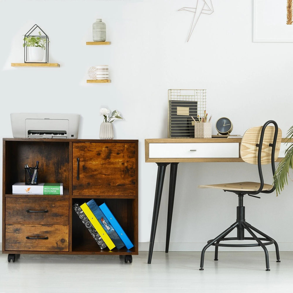 This mobile file cabinet provides flexible, compact storage for home or small office use. With two roomy drawers, two open compartments and a door cabinet, it keeps files, stationery and a desktop printer organised while keeping your workspace tidy. The wide top is sized to accommodate a printer or decorative items.