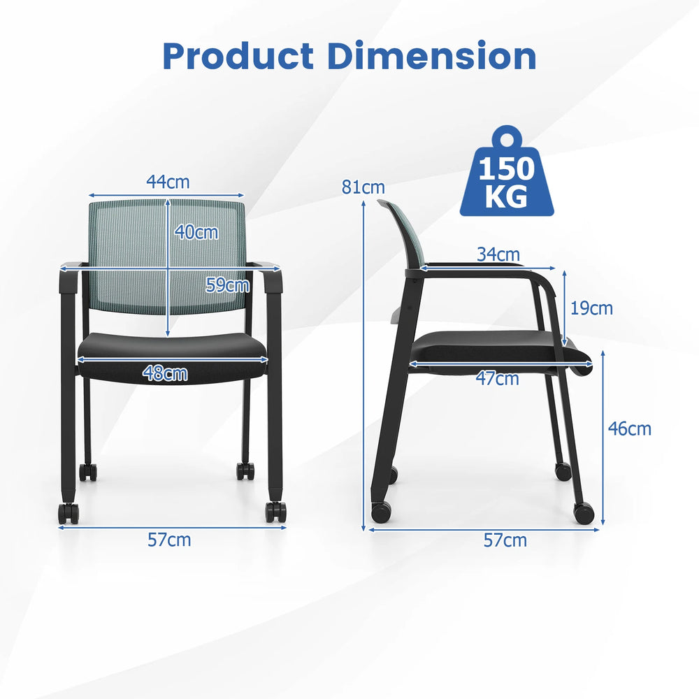 Colour: Grey Material: Metal, Nylon, Mesh, Sponge, Plastic Overall Dimensions: 59 x 57 x 81 cm (L x W x H) Seat Size: 48 x 47 cm (W x D) Seat Height from Ground: 46 cm Backrest Height: 40 cm Weight Capacity: 150 kg Net Weight: 15 kg Box Qty:1(May vary by batch) Package Includes: 2 x Reception Chairs 1 x Instruction Manual