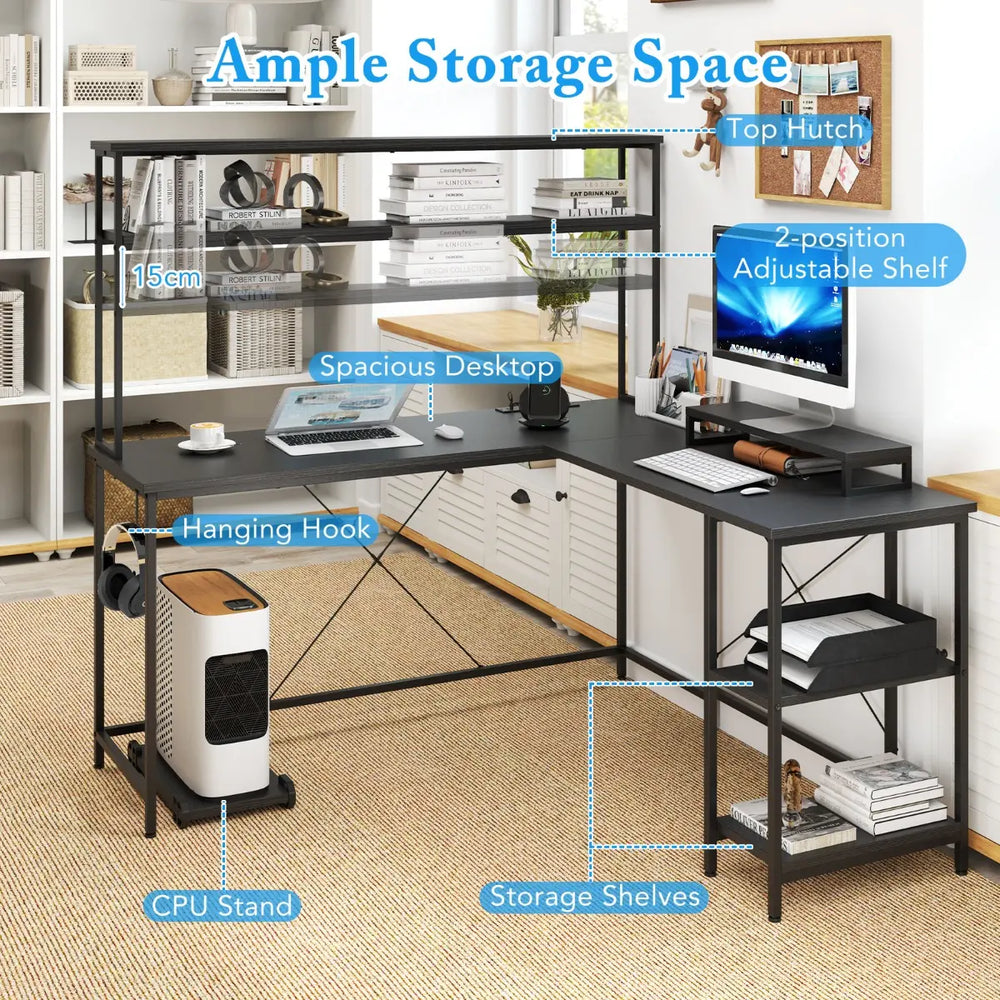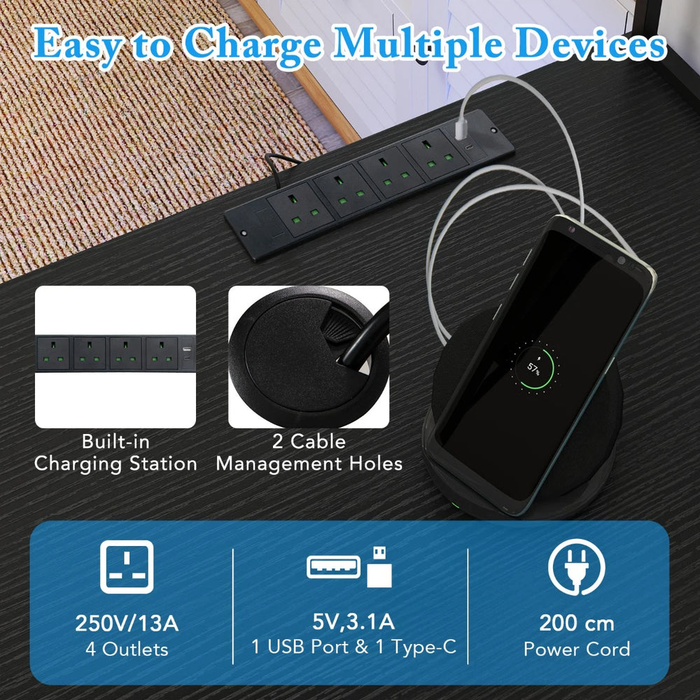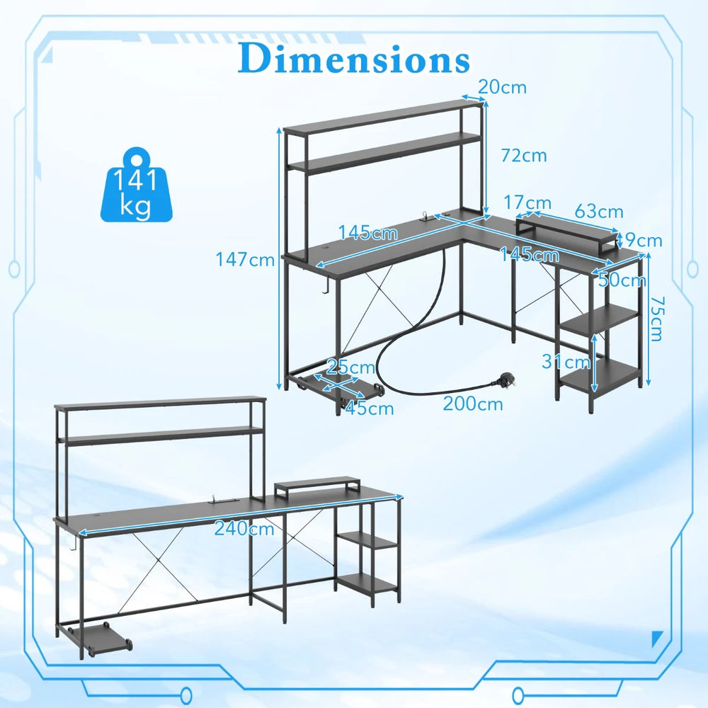 Colour: Black Material: Engineered Wood, Metal Overall Dimensions: 145 x 145 x 147 cm (L x W x H) Dimensions of Monitor Stand: 63 x 17 x 9 cm (L x W x H) Dimensions of CPU Stand: 45 x 25 cm (L x W) Width of L-shaped Tabletop: 50 cm Length of Long Straight Tabletop: 240 cm Height from Tabletop to Ground: 75 cm Height Between Storage Shelves: 31 cm Height of Top Shelf: 72 cm Width of Top Shelf: 20 cm Adjustable Range of Top Shelf: 15 cm 4 Outlets: 250V 13A 50Hz USB Port: 12V 1.5 A Max. Type-C Port: 12V 1.67 A Max. Effective Control Distance: 30 m Net Weight: 34 kg Weight Capacity of Tabletop: 141 kg Weight Capacity of Each Shelf: 20 kg Box QTY: 1(May vary by batch) Package Includes: 1 x L-shaped Desk 1 x Instruction Manual