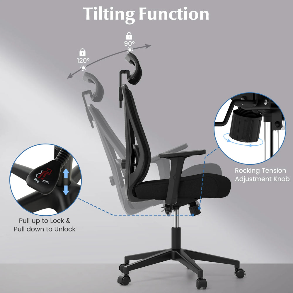 Color: Black Material: PP, Mesh Fabric, Sponge, Nylon Overall Dimension: 70 x 63-79 x 99-129 cm (L x W x H) Size of Headrest: 33 x 6 cm (L x H) Size of Backrest: 49 x 54 cm (L x H) Inner Spacing of Armrests: 52 cm Height of Armrests: 64-81 cm Size of Seat: 53 x 51 cm (W x D) Height of Seat: 48-57 cm Distance of Up & Down Adjustment (Lumbar Support): 5 cm Distance of Forward & Backward Adjustment (Lumbar Support): 3 cm Adjustable Height of Headrest: 9 cm Adjustable Angle of Headrest: 70 Adjustable Height of Armrests: 8 cm Max Load Capacity: 150 kg Net Weight: 14 kg Package Includes: 1 x Office Chair 1 x User Guide