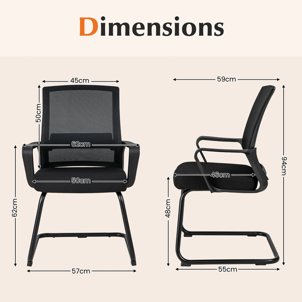 Color: Black Material: Mesh, Sponge, Metal Overall Dimension: 24.5" x 23.5" x 37"(L x W x H) Backrest Size: 18" x 19.5"(L x W) Seat Size: 19.5" x 18"(L x W) Height from Seat to Ground: 19" Height from Armrest to Ground: 24.5" Length Between Armrest: 24.5" Thickness of Seat: 3" Dimension of Base: 22.5" x 21.5"(L x W) Net Weight: 19 lbs Weight Capacity: 220 lbs Package Includes: 1 x Office Guest Chair 1 x Instruction