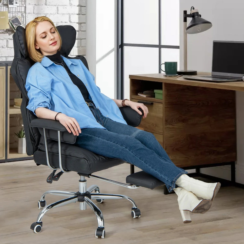 Color: Black Material: PU Leather, Sponge, Plywood, Metal Overall Dimension: 74 x 70-138 x 106-125 cm (L x W x H) Size of Headrest: 49 x 21 cm (L x H) Size of Backrest: 62 x 80 cm (L x H) Size of Seat: 57 x 53 cm (W x D) Height of Seat: 46-54 cm Thickness of Seat: 10 cm Height of Armrests: 62-70 cm Size of Footrest: 34 x 20 cm (L x W) Retractable Distance of Footrest: 30 cm Size of Lumbar Support: 41 x 25 cm (L x W) Reclining Angle of Backrest: 90°-135° Max Load Capacity: 150 kg Net Weight: 20 kg Package Includes: 1 x Executive Chair 1 x User Guide