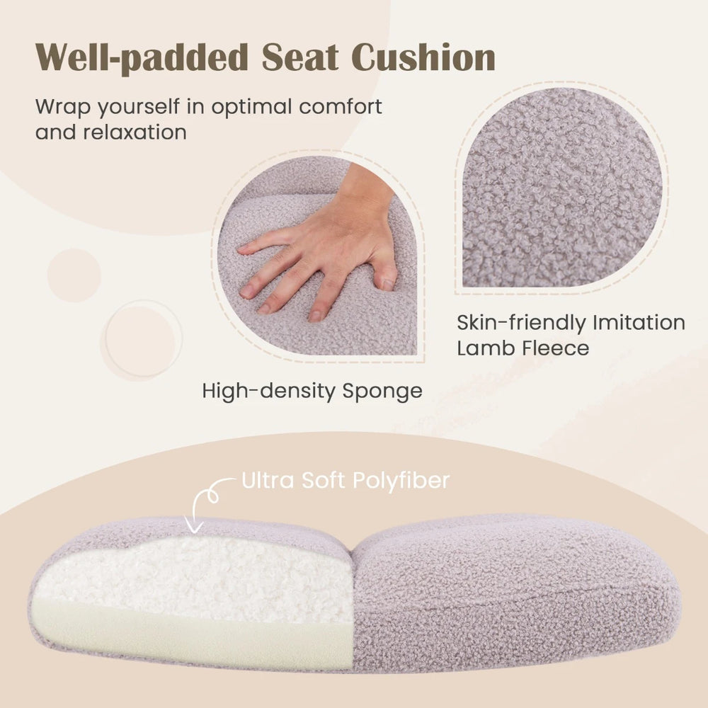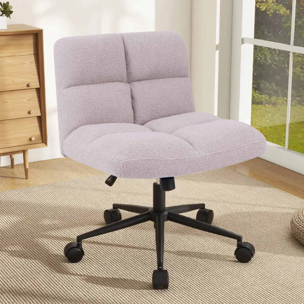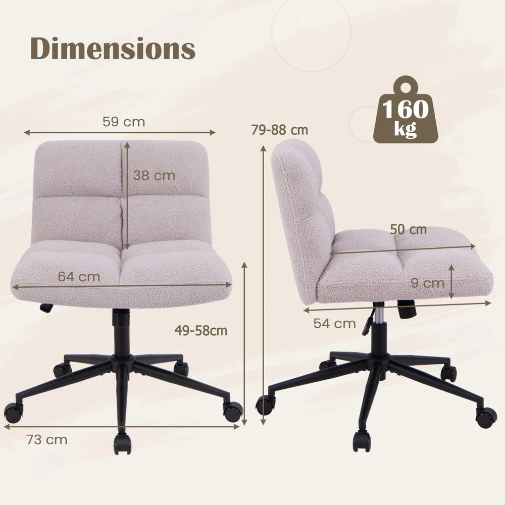 Upgrade your workspace with the cross-legged chair with wheels. This upholstered home office chair combines comfort and style, featuring a padded wide seat for cross-legged sitting. Upholstered with skin-friendly imitation lamb fleece, the office desk chair offers a plush and cozy seating experience. Experience customized seating with multiple adjustments, including an adjustable height design and a rocking function with an adjustable angle for added relaxation. The swivel feature adds convenience and flexibility to your workspace setup. The 360 rolling wheels allow for effortless movement, while the stable 5-claw metal base ensures stability and security. This modern swivel desk chair is perfect for various settings, including home offices, bedrooms, and studies. Comfortable Cross-legged Chair: The armless seat with a wide U-shaped cushion provides ample space for cross-legged sitting, ensuring comfort during long hours of use. Its ergonomic backrest provides excellent lumbar support, reducing back strain. This cross-legged chair is perfect for those who like to sit cross-legged while working or studying. Exceptional Sitting Comfort: The seat and backrest are filled with ultra soft polyfiber and high density sponge, providing ultimate comfort and support for long hours of sitting. Upholstered with skin-friendly imitation lamb fleece, this office desk chair offers a soft, comfortable surface for a cozy seating experience. Multiple Adjustments for Customized Seating: This computer desk chair features an adjustable height design with a range from 49-58 cm, ensuring you can find the perfect seating position. The rocking function (adjustable angle: 100-120) allows you to enjoy the gentle rocking motion for added relaxation during work or study. Smooth Mobility and Stability: Equipped with smooth universal wheels, this cross-legged vanity chair offers easy mobility across various surfaces. With its stable 5-claw metal base, this chair offers enhanced stability and security, providing peace of mind even when moving or shifting positions. It can support weight up to 160 kg. Modern and Versatile Design: The sleek, modern design of this swivel task chair enhances the aesthetic appeal of any room. It is perfect for any space, whether it's your living room, office, bedroom, or study. When not in use, this armless desk chair can be pushed under the desk to save floor space.