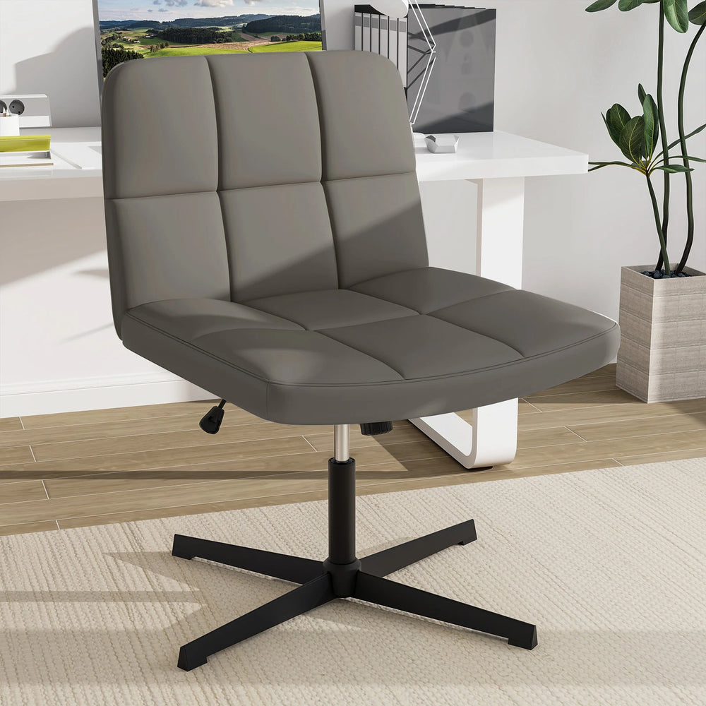 Designed for comfort and style, this armless swivel chair features a wide seat and PU leather upholstery, ensuring optimum comfort and support whether you are working, studying, or enjoying a makeup session. With its swivel and height adjustable design, along with a gentle rocking function, this cross-legged chair provides optimal flexibility and comfort for your daily tasks. The metal base, designed without wheels, promotes stability for a secure seating solution. Our PU leather desk chair combines practicality with luxury, offering an inviting seating option that enhances productivity and relaxation. Cross Legged Chair: Our cross-legged chair features a wide U-shaped seat cushion that helps alleviate pressure on the tailbone and supports better posture for extended sitting sessions. Its specially contoured design accommodates various sitting positions, allowing you to work, meditate, or relax with ease. Multiple Adjustments: Our criss cross chair offers multiple adjustments to suit your needs. It is effortless to adjust the seat height with a 13cm height range, allowing you to match varying desk heights. SGS certified gas lift takes the using safety to higher level. Enjoy the freedom to rock back and forth (100- 120) gently while you work or relax. 360 degree swivel function provides flexibility and convenience for multitasking. PU Upholstered Seat: The thick seat padding, filled with high-density sponge, offers optimal comfort for extended periods of sitting. Furthermore, the premium PU leather upholstery not only looks refined but is also easy to maintain, with better wear resistance. Sturdy and Stable Construction: Supported by cross-legged metal legs, our office desk chair ensures exceptional durability and stability for daily use. It can support a weight of 150kg. Additionally, the non-slip foot pads offer added stability while protecting floor from scratches. Multi-scene Use: Whether you're working at your desk, browsing the web, or applying makeup at your vanity, our home office swivel chair effortlessly adapts to various settings. When not in use, simply tuck this armless chair underneath the table to save floor space. Sleek and Stylish Design: Elevate your living space with our chic and contemporary chair, boasting a sleek design that seamlessly integrates with any decoration style. This PU leather armless chair adds a touch of sophistication to your home office, study, or bedroom.