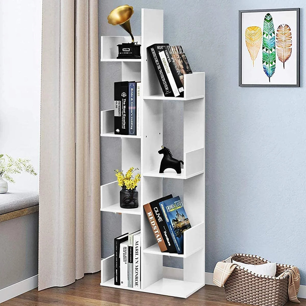 This tree-shaped bookcase offers a stylish, space-saving solution for organising books, magazines and decorative items across eight open compartments. Its compact footprint makes it suitable for living rooms, studies and bedrooms where floor space is limited.