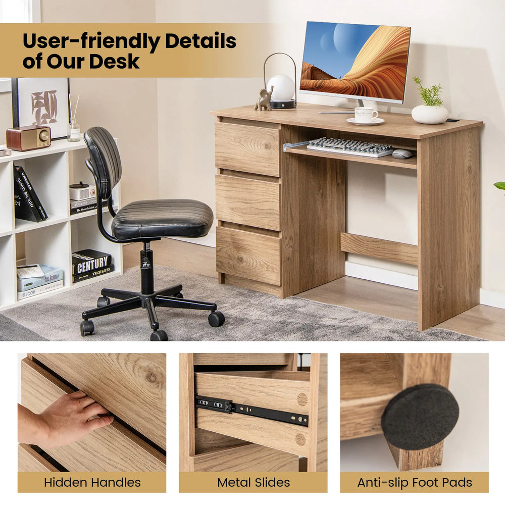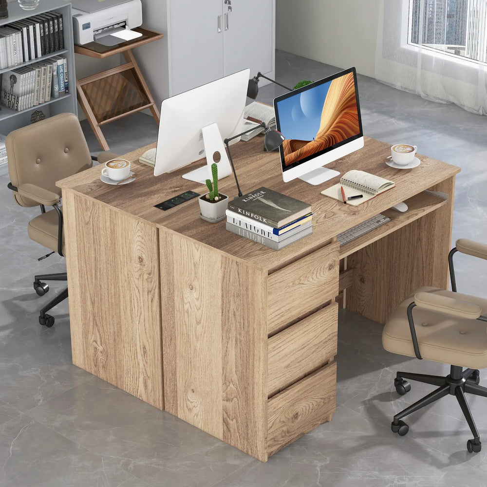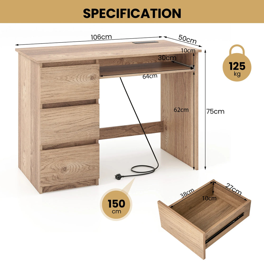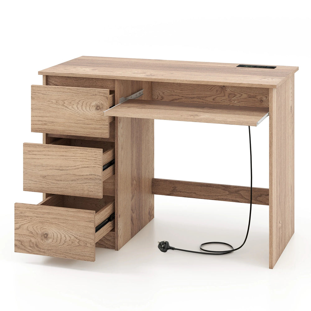 Computer Desk with Power Outlet and 3 Large Drawers-Natural